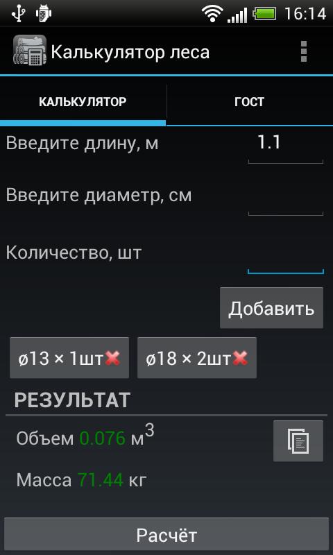 "Калькулятор леса" (кубатурник) предназначен для расчета объема круглых лесоматериалов согласно таблицам ГОСТ 2708-75. Калькулятор также позволяет рассчитывать плотность и массу древесины в зависимости от породы и влажности (справочник плотности древесины)Last updated on Aug 4, 2015
