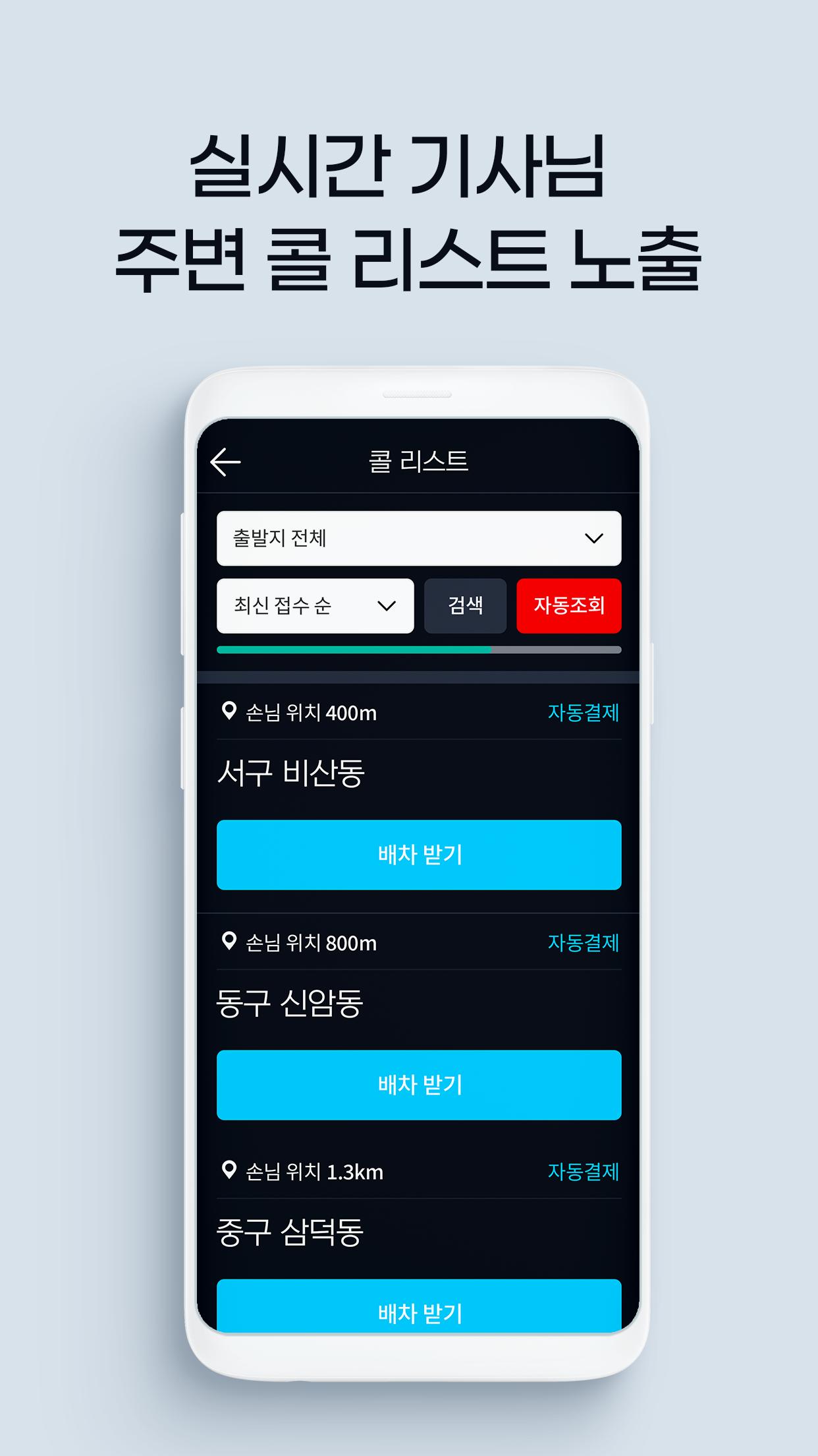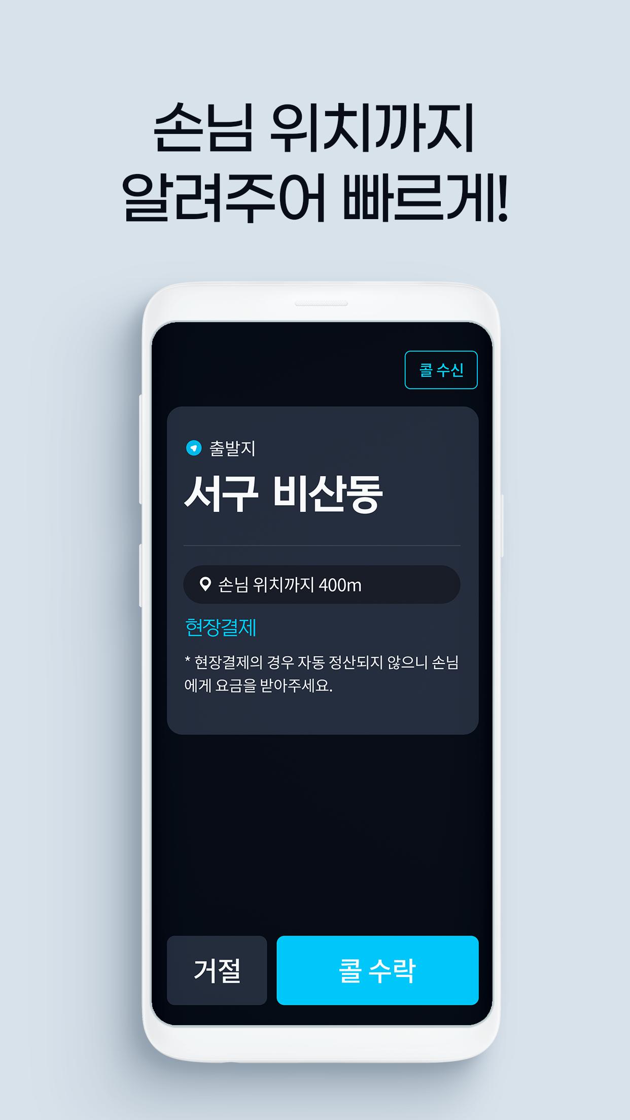 콜 수락 시 기사님에서 고객까지 거리와 출발지를 미리 볼 수 있습니다.