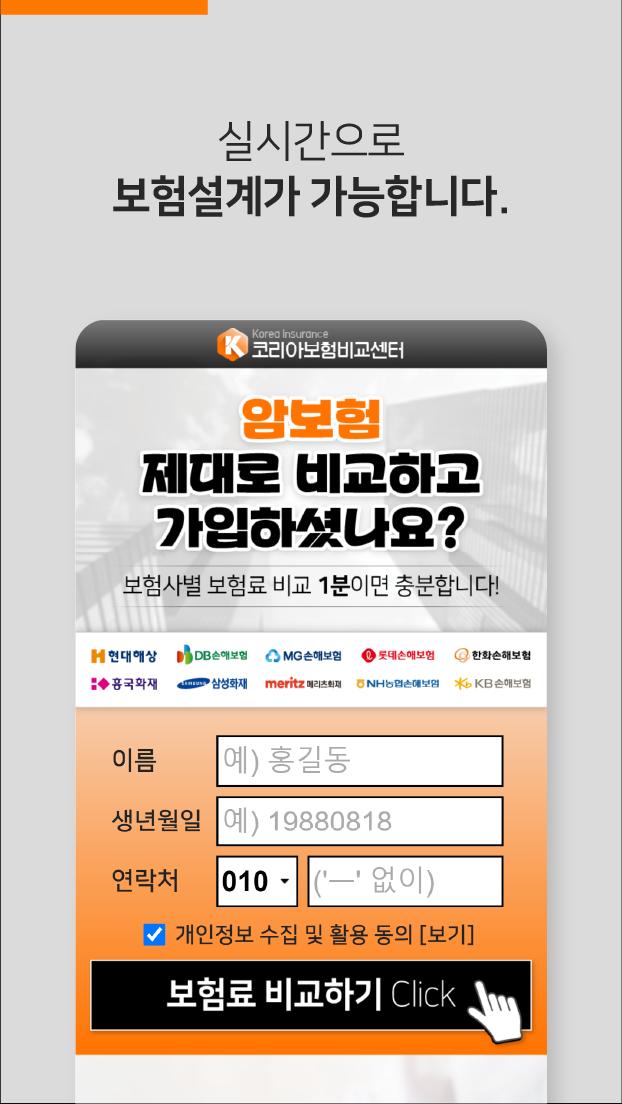 더 이상 혼자서 고민하지 마시고 암보험비교사이트 암보험가입시 갱신형암보험 50대암보험 앱을 통해 나에게 가장 필요하고 알맞은 암보험을 찾아 가입하세요. 복잡한 인증 절차 없이 간단한 정보 입력만으로 모든 서비스를 이용하실 수 있습니다.