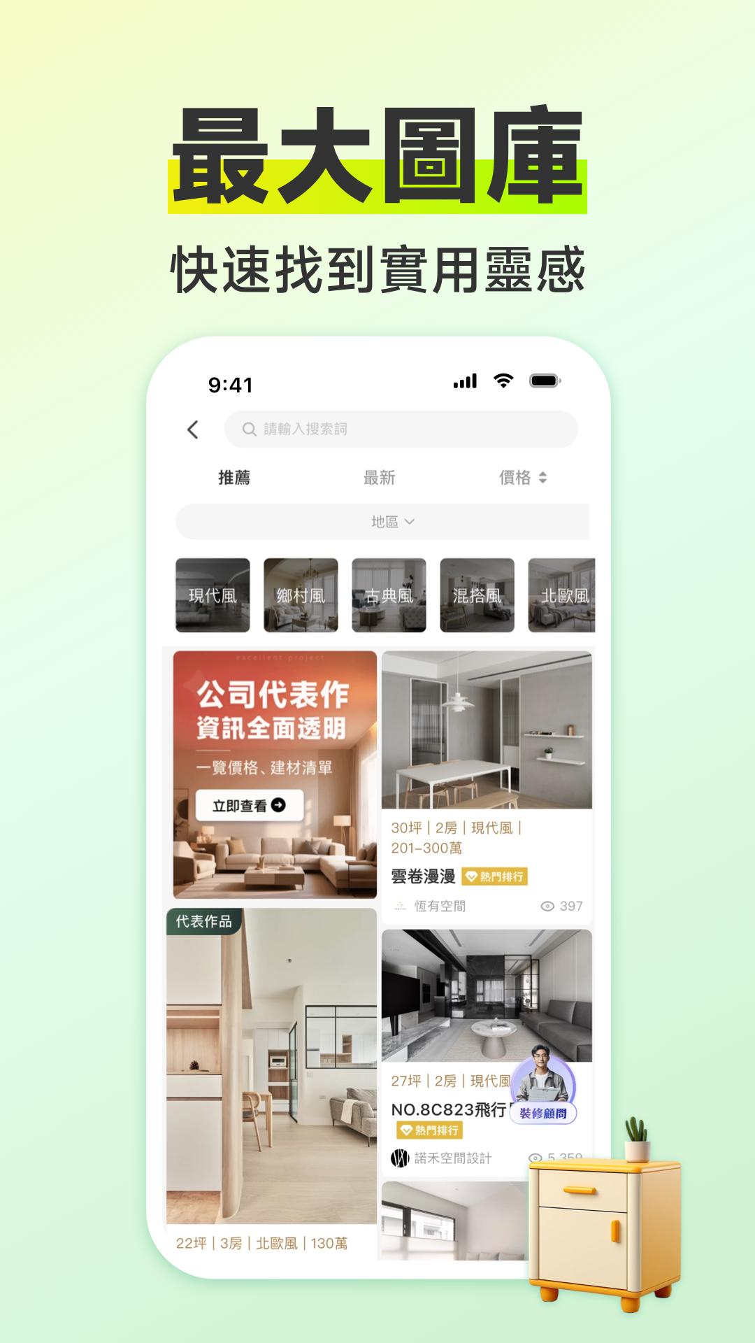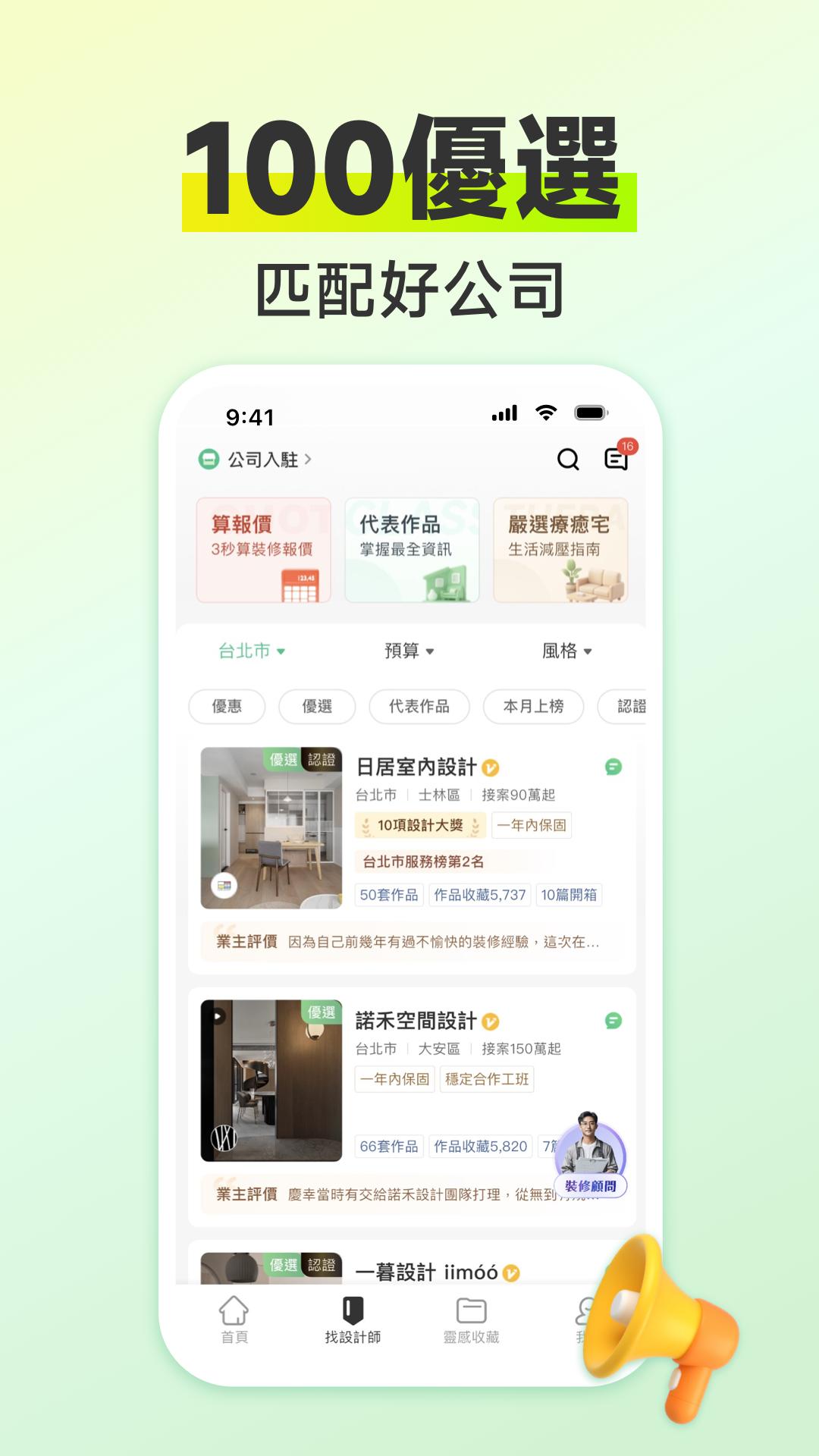 100 Interior Design은 대만 전역의 디자인 회사, 인테리어 디자인 작품, 장식 지식 및 정보를 한자리에 모은 장식 미디어 플랫폼입니다. 사진, 기사, 영상 등 멀티미디어 방식을 통해 소유자에게 다양한 장식 문제에 대한 솔루션을 제공하여 장식 전 영감과 디자인 회사를 찾고, 장식 중에 전략과 계획을 찾고, 장식 후 부드러운 가구 매칭 등 질문을 할 수 있도록 도와줍니다. 가정 장식과 생활의 문제를 쉽게 처리하고 100점짜리 꿈의 집을 지을 수 있도록 도와주세요.