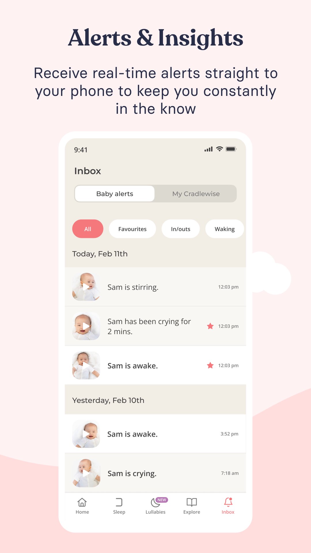 알림: 아기가 깨어나거나, 잠들거나, 울기 시작하면 알림을 받습니다.