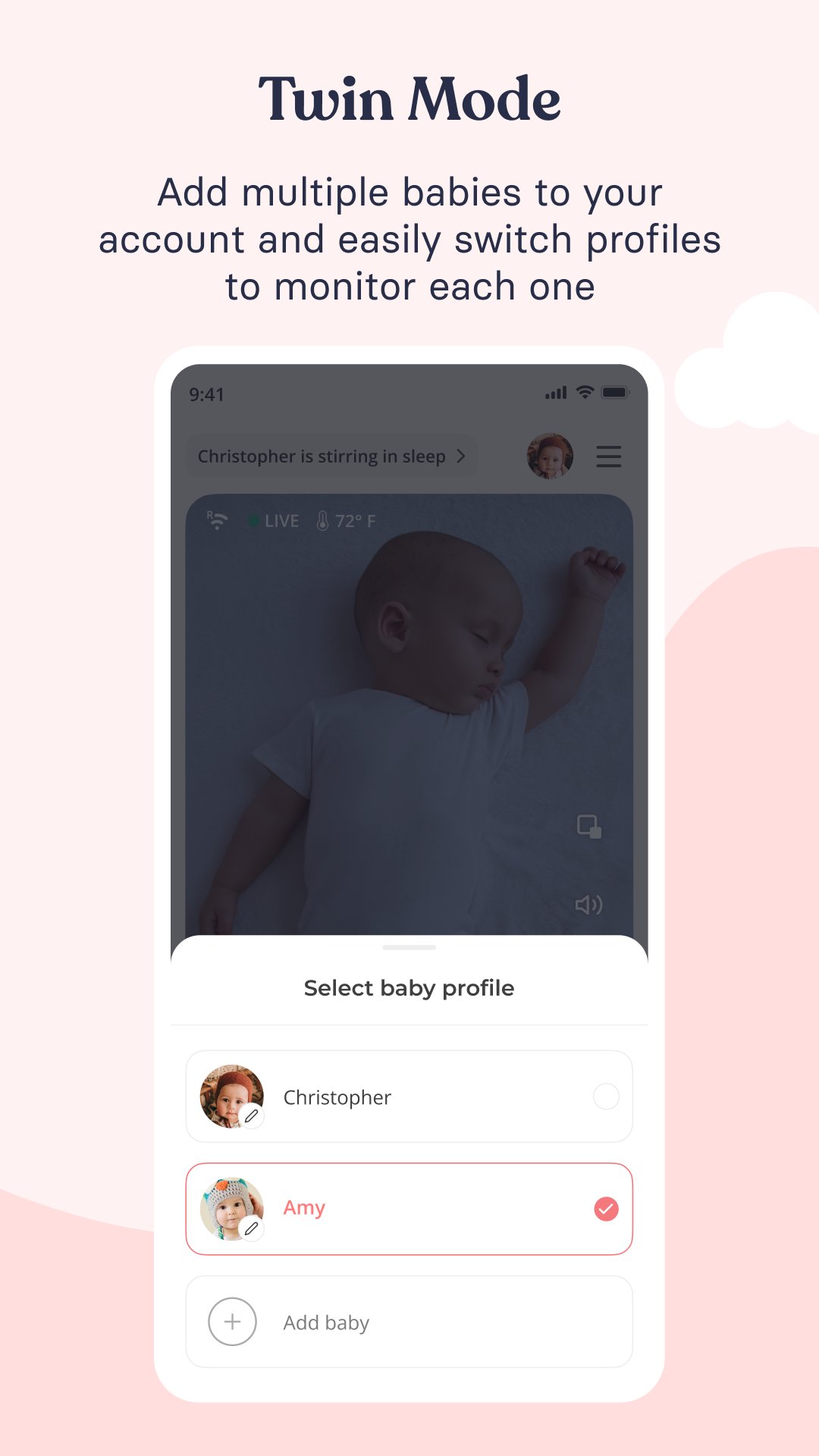 트윈 모드: 프로필에 여러 명의 아기를 추가하세요. 아기 프로필 간을 원활하게 전환하여 단일 계정에서 연결된 모든 유아용 침대를 관리하고 볼 수 있습니다.