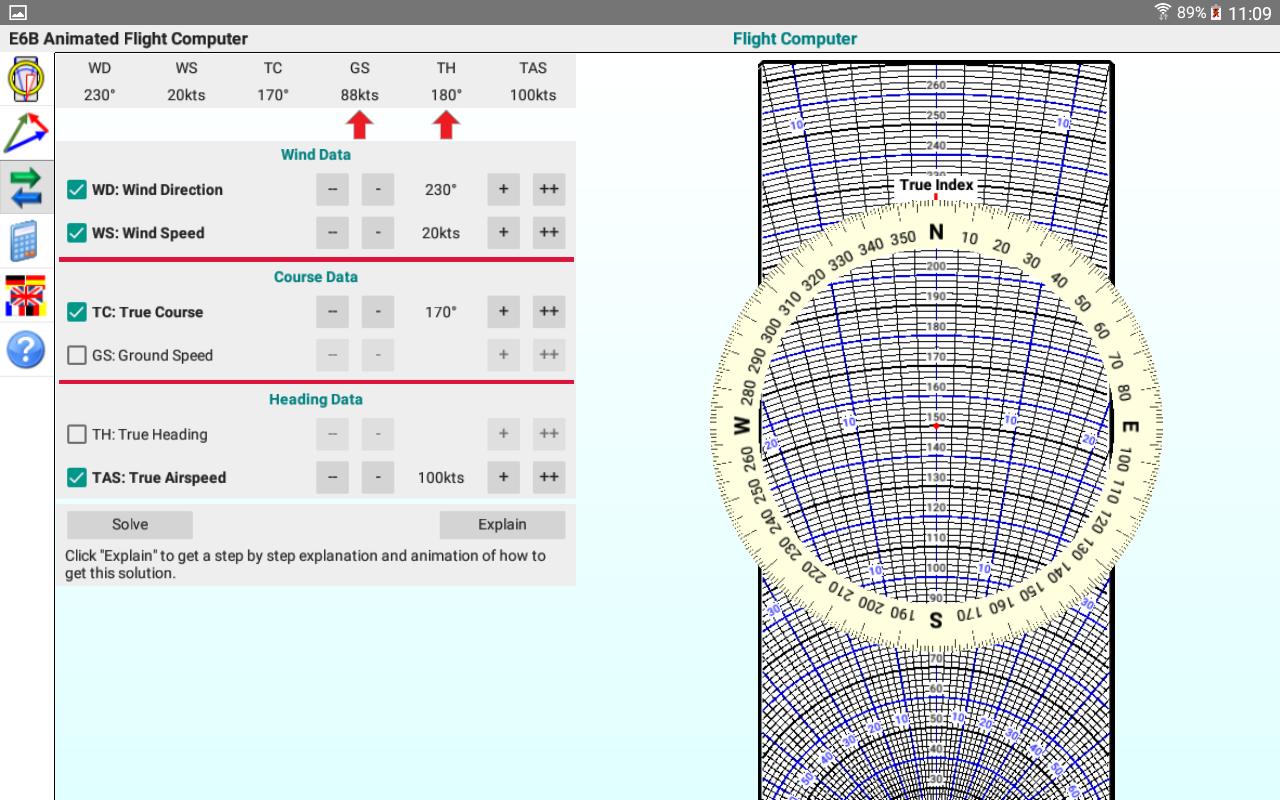 이 앱은 6가지 값(3가지 속도, 3가지 각도) 중 4가지 값을 입력하고 나머지 2가지를 계산하여 바람의 삼각형을 풉니다. 그런 다음 각 단계를 수행하는 방법을 보여주는 애니메이션 비행 컴퓨터를 사용하여 솔루션을 얻는 방법을 단계별로 설명합니다. 애니메이션은 디스크를 회전하고, 디스크를 밀고, 표시를 추가합니다. 또한 솔루션을 향한 각 단계에 사용할 주어진 값을 보여줍니다.