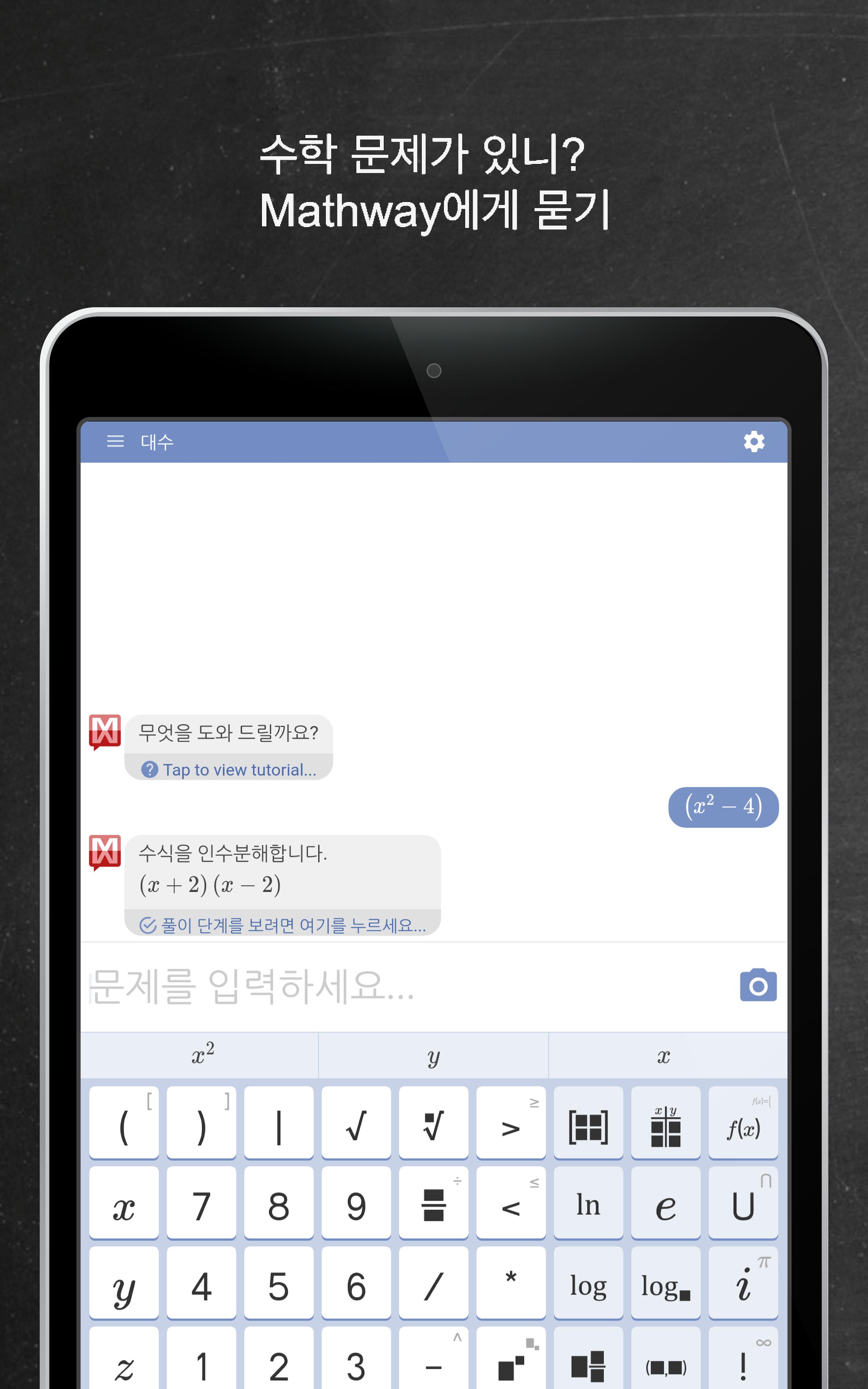 수백만의 사용자를 보유하고 수억 개의 문제를 해결해 온 Mathway는 휴대용 과외 선생님처럼 언제 어디서나 문제 풀이를 도와드릴 수 있습니다.