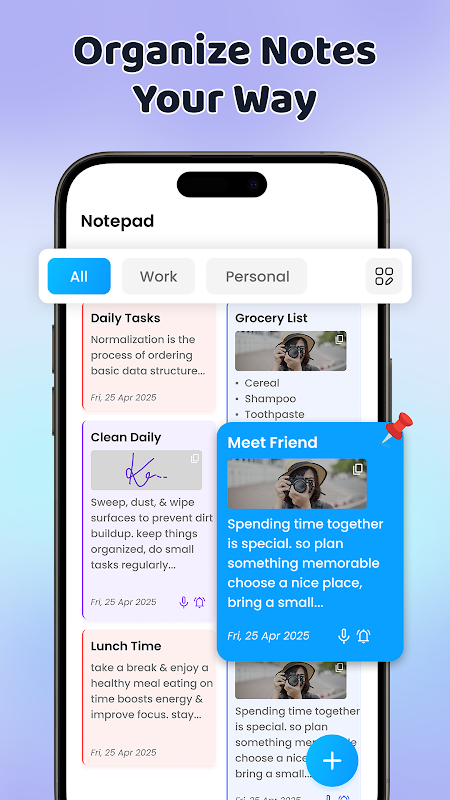 노트: 메모장 & 작업 미리 알림은 빠른 메모 작성, 체크리스트 및 작업 관리를 위한 간편하면서도 강력한 메모 앱입니다. 메모, 미리 알림, 캘린더 이벤트를 모두 한곳에서 관리하세요. 스티커 메모를 사용하면 간편하게 확인하고 작업을 놓치지 않을 수 있습니다. 학교, 직장, 일상생활 등 어떤 용도로든 노트가 필요하든, 이 메모 앱은 아이디어를 안전하고 체계적으로 보관해 줍니다. 깔끔하고 사용하기 쉬운 인터페이스로 할 일 목록, 회의 메모, 빠른 미리 알림을 만드는 데 적합합니다. 작업과 메모가 모두 동기화되어 바로 사용할 수 있도록 준비되어 있어 생산성을 유지할 수 있습니다.