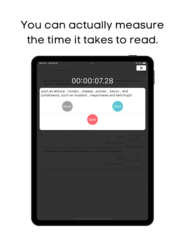 대학에서 시간 제한으로 인해 발표 시간을 10분 미만으로 유지하기 어려울 때 이 앱을 사용했습니다. 이 앱은 대략 몇 초가 걸리는지 보여줍니다. 실제로 읽는 데 몇 초가 걸렸는지 기록할 수도 있습니다. 몇 초가 걸릴지 대략적으로 메모를 한 다음 타이머를 사용하여 자세한 읽기 속도를 기록합니다. 이 앱을 사용한 이후로 프레젠테이션을 훨씬 더 빠르게 구성할 수 있었고 시간이 지나도 실수가 없었습니다.
