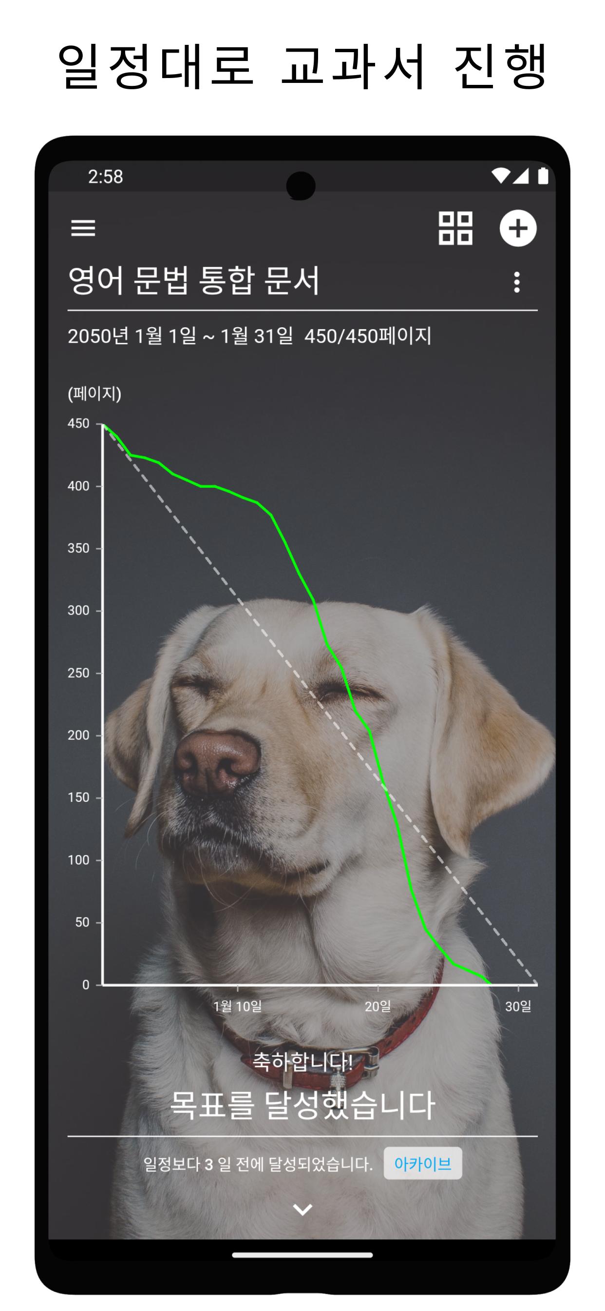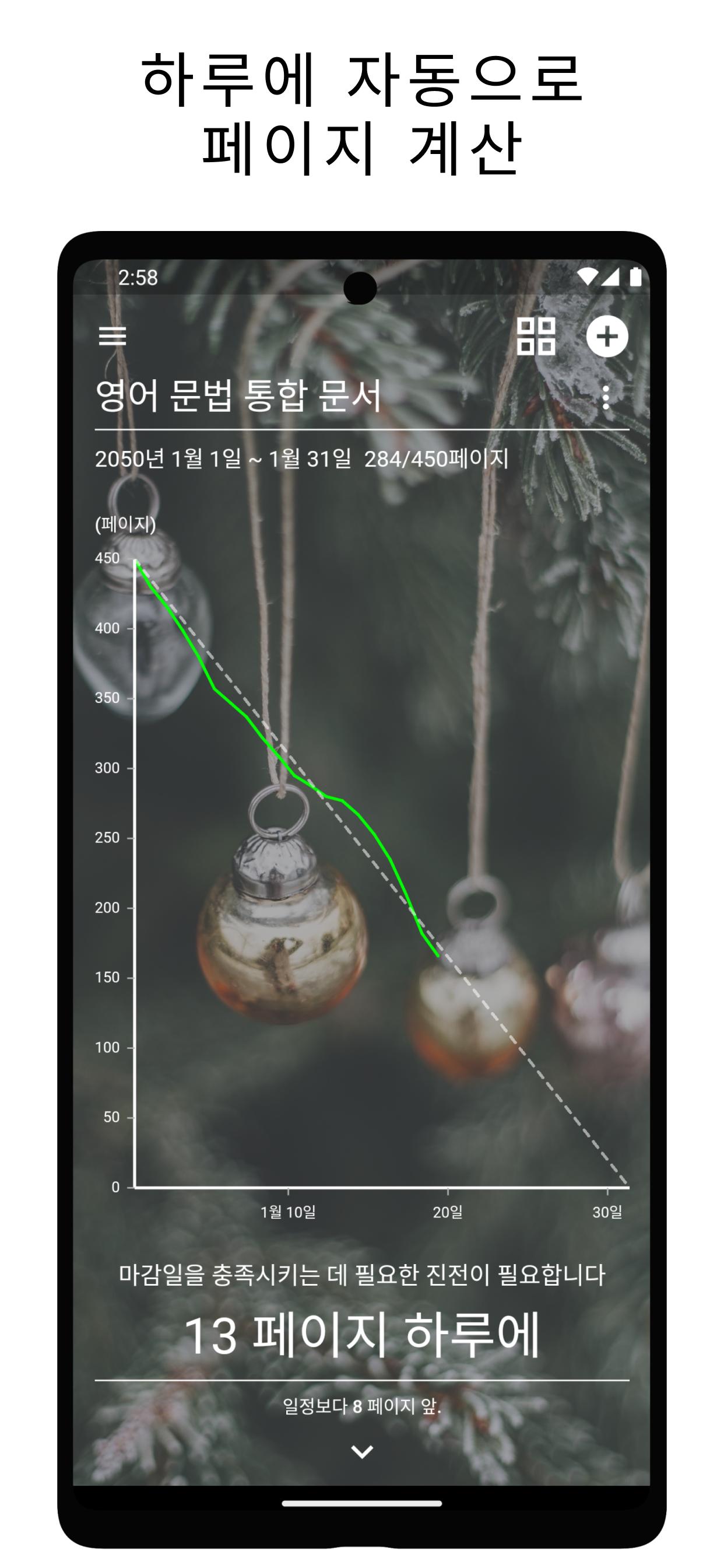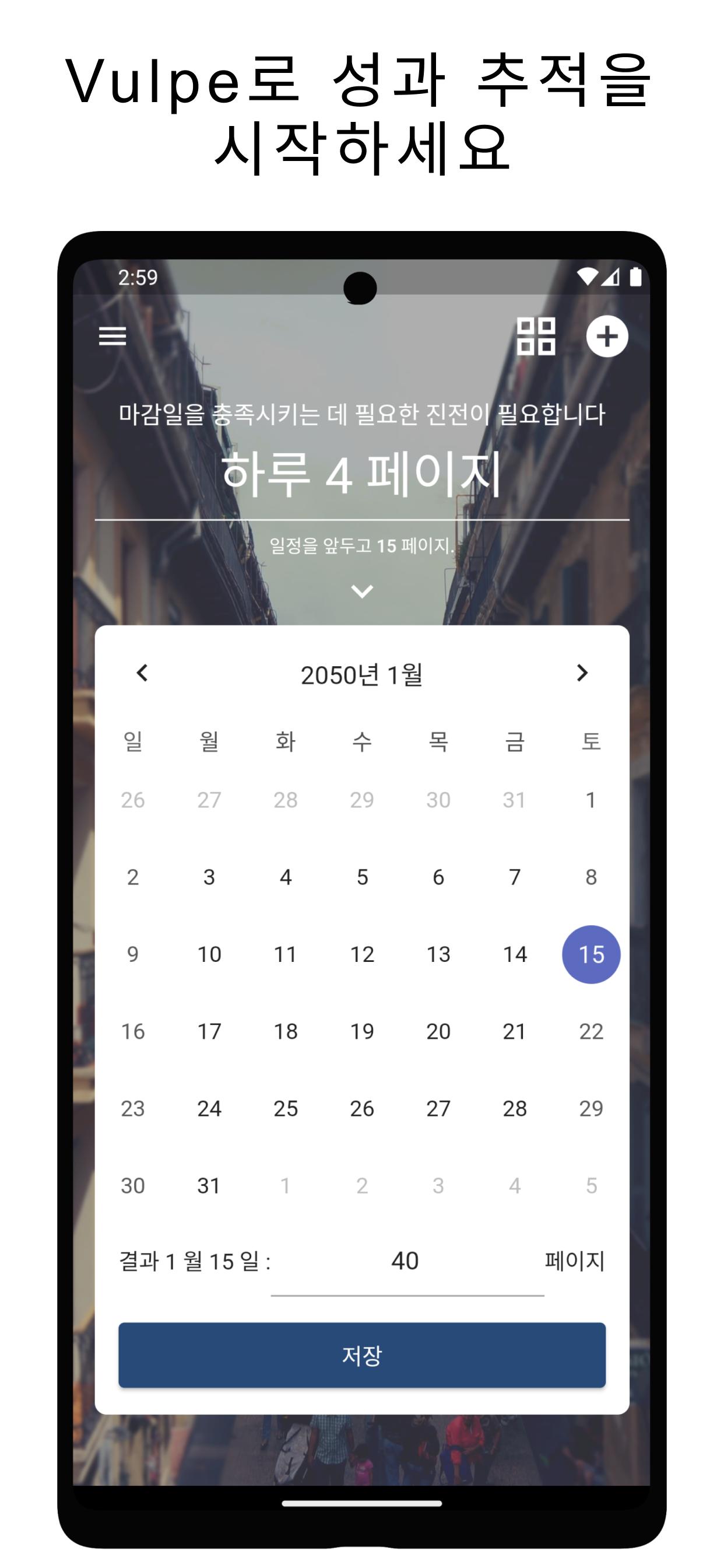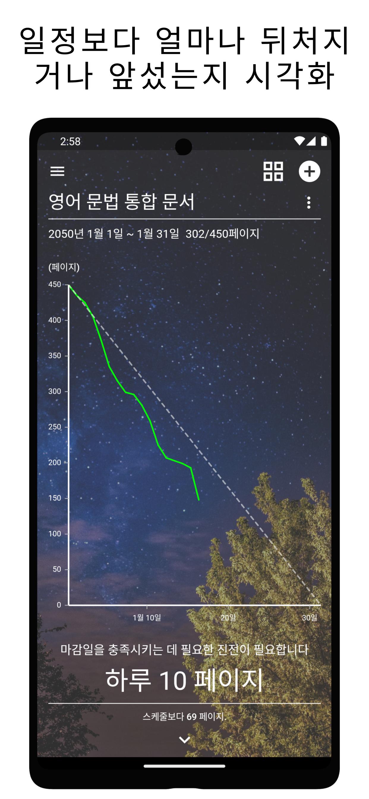 마감일을 설정하면 Vulpe는 "목표 날짜까지 완료하기 위해 해당 날짜에 진행해야 하는 페이지 수"를 자동으로 계산합니다. 당신이해야 할 일은 표시된 페이지 수를 따르는 것입니다.