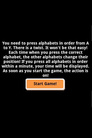 In this action game you need to press alphabets from A to Y in order. But there is a twist. It won't be that easy. Every time you press a correct alphabet, the other alphabets will change their position! Try to complete the game under a minute and you can see your time. The game requires you to have fast reactions and quick eye movement.Last updated on Sep 21, 2016
