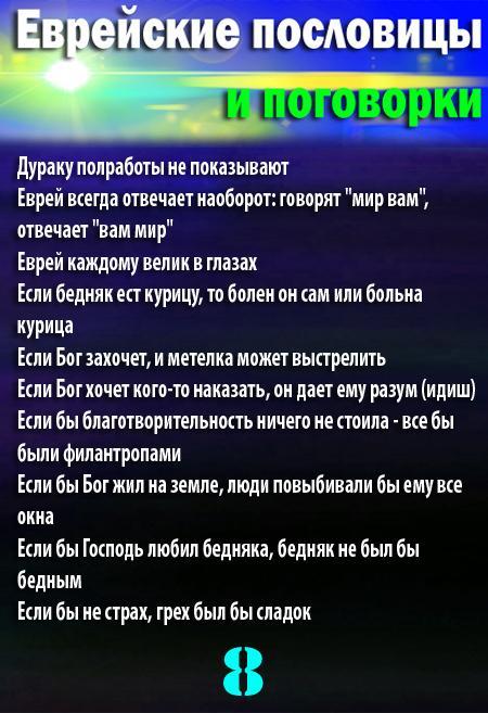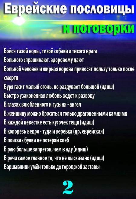 Окунись в мир еврейской мудрости! Евреи - народ с глубокой древней письменной культурой. Еврейский язык богат знаниями, сборник лучших афоризмов и анекдотов от евреев смогут помочь тебе поумнеть. Это лучшие фразы, еврейские пословицы и еврейские анекдоты. Лучшие красивые фразы с сарказмом про жизнь и любовь, несут глубокий смысл. Иногда даже смешные фразы могут научить многому. Это знаменитые еврейские ироничные фразы с сарказмом. Еврейский народ славится своей иронией, в его пословицах и поговорках часто находится глубокий юмор. Лучшие приколы и шутки это те, которые заставляют задуматься. Только чтобы понять этот глубокий смысл нужен большой ум. Многие русские пословицы и поговорки берут свою основу в еврейской мудрости.Last updated on Dec 24, 2017
