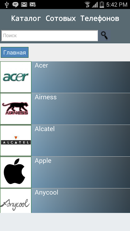 Acer, Airness, Alcatel, Apple, Anycool, AnyDATA, Asus, AT & T, BBK ...