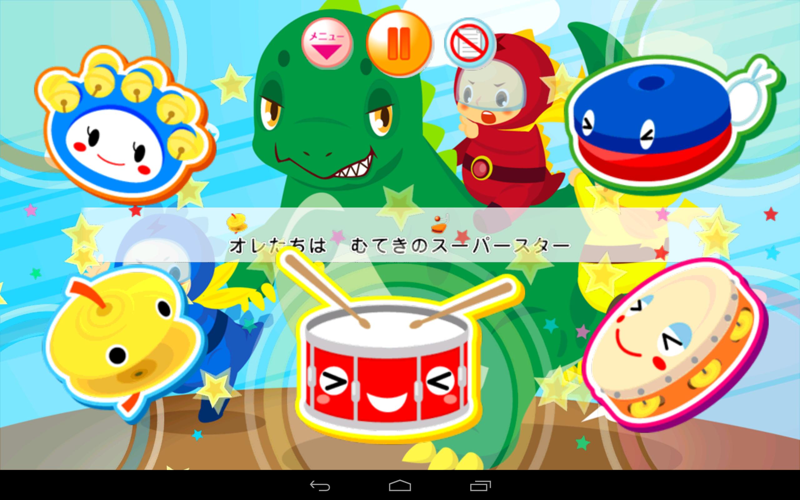 ・おとうさん、おかあさんといっしょに楽しむことを目指して企画した赤ちゃんアプリです。楽器(たいこの達人のドラムくんなど)は上の2つがお父さんお母さん用、下3つが赤ちゃん用です。赤ちゃんがたっちしておかあさんといっしょに楽しむのに最適な配置にしました。親子で一緒に楽しめる子供向けゲームです。