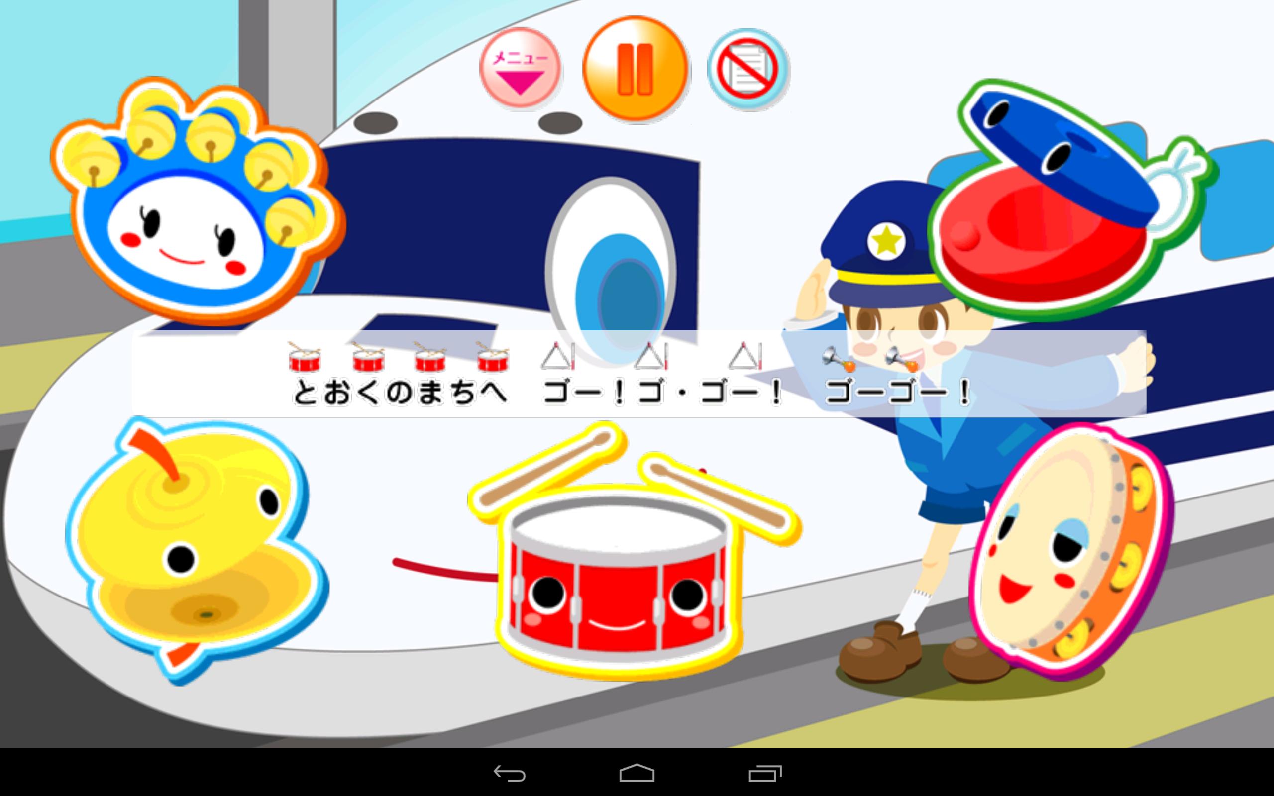 ・登場する楽器は全て本物の楽器(太鼓(たいこ)やトライアングルをはじめ、カバサやギロなどの赤ちゃん・幼児向けの珍しい楽器も)を演奏して収録しています。スマートフォンならではの絵と音で楽しく楽器を覚えることができます。また、歌詞に合わせて背景絵が変化するので、絵本の様に楽しむこともできます。