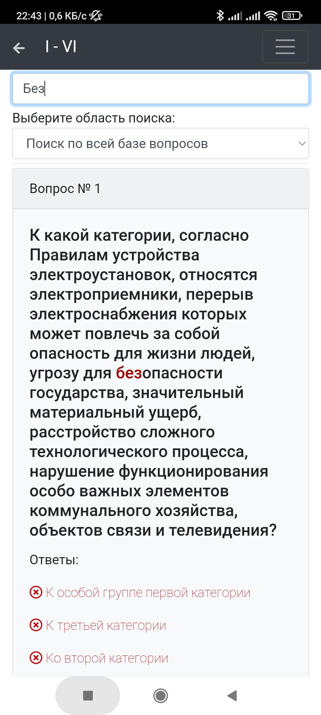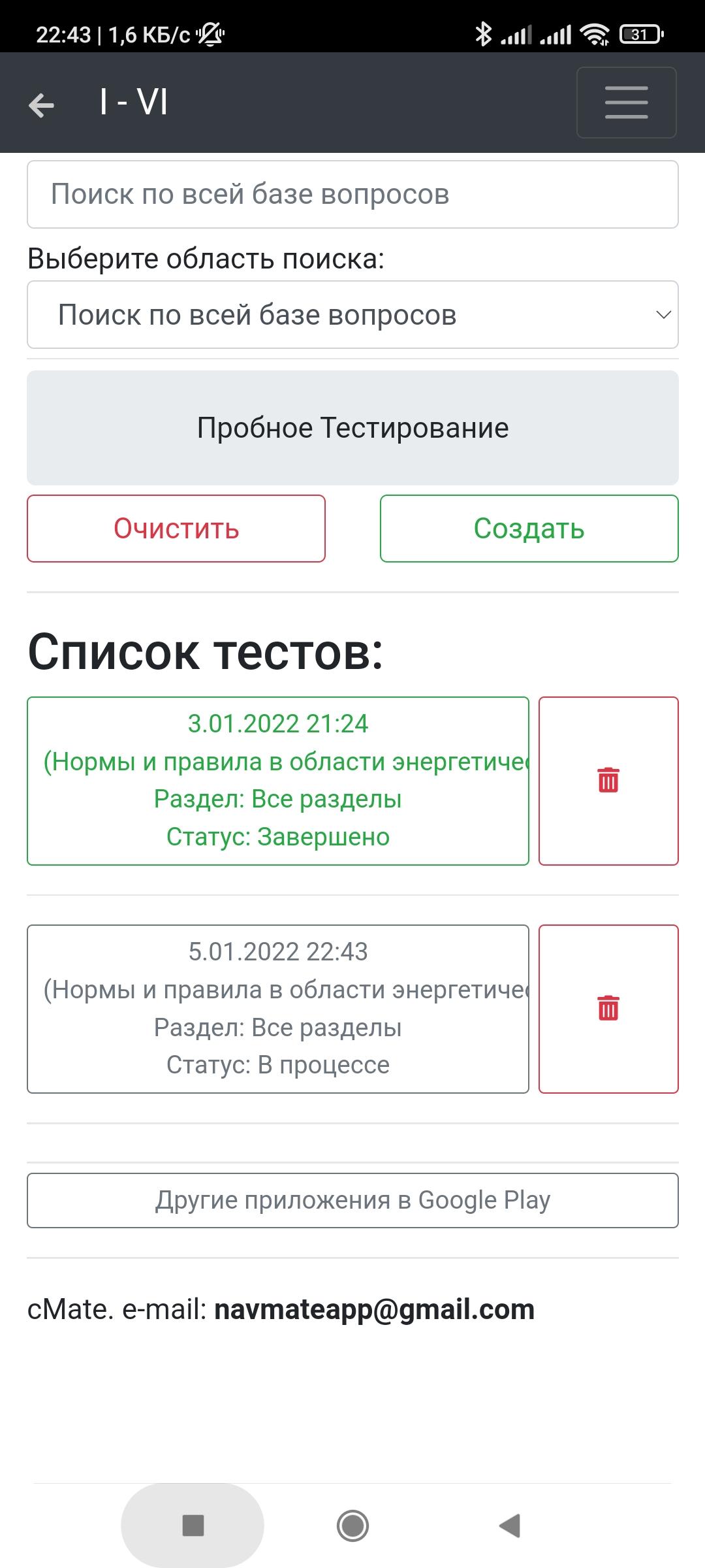 Приложение оснащено удобным поиском по всей базе вопросов или отдельной теме.