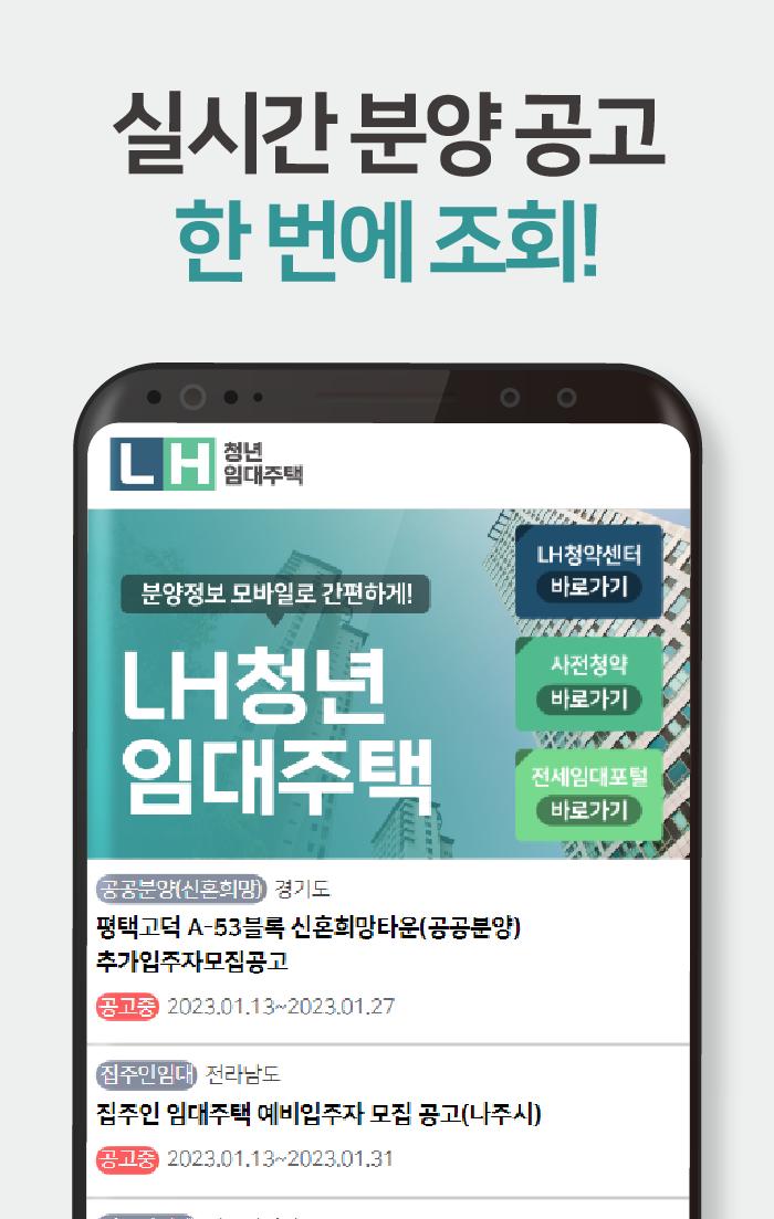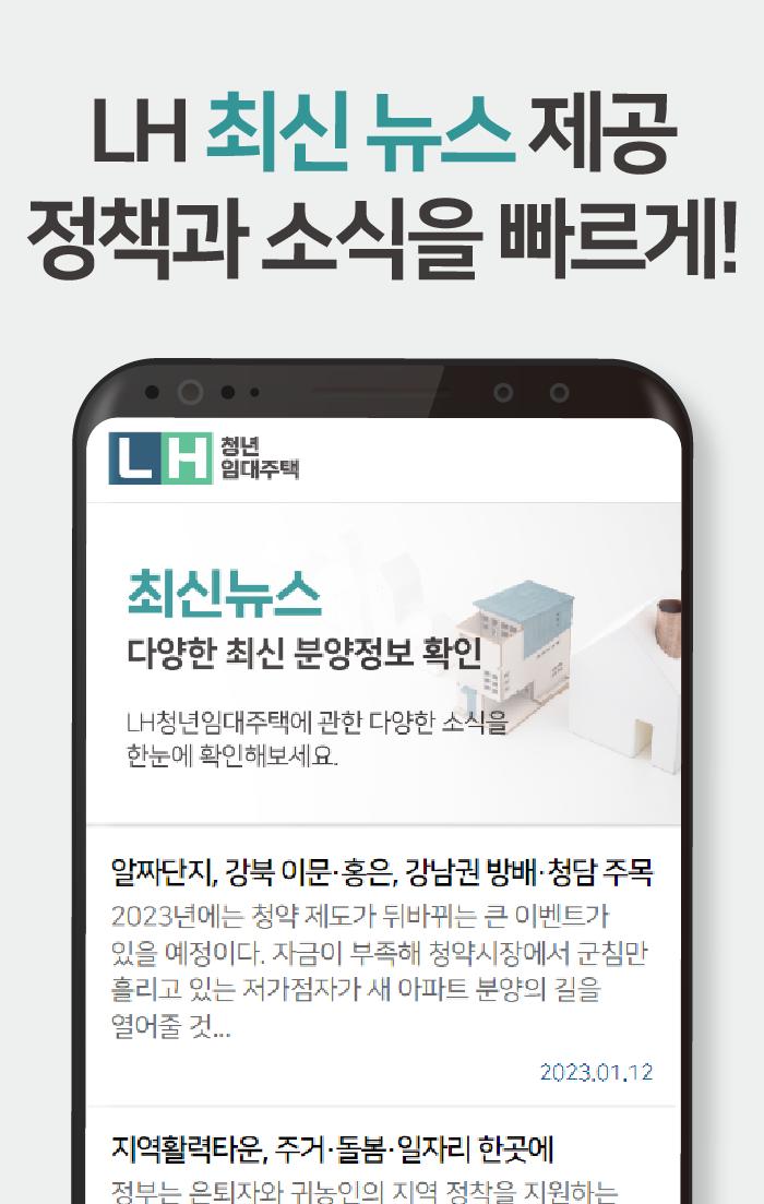 Perumahan Sewa Belia 2023 LH, Pajakan Jeonse Belia, Perumahan Belia, Langganan, dll. Semak kandungan jualan/langganan dan pengumuman jualan masa nyata dengan cepat dengan pemberitahuan! Anda boleh mengetahui dengan mudah semua maklumat yang anda ingin ketahui daripada aplikasi Perumahan Sewa Belia LH pada telefon bimbit anda.