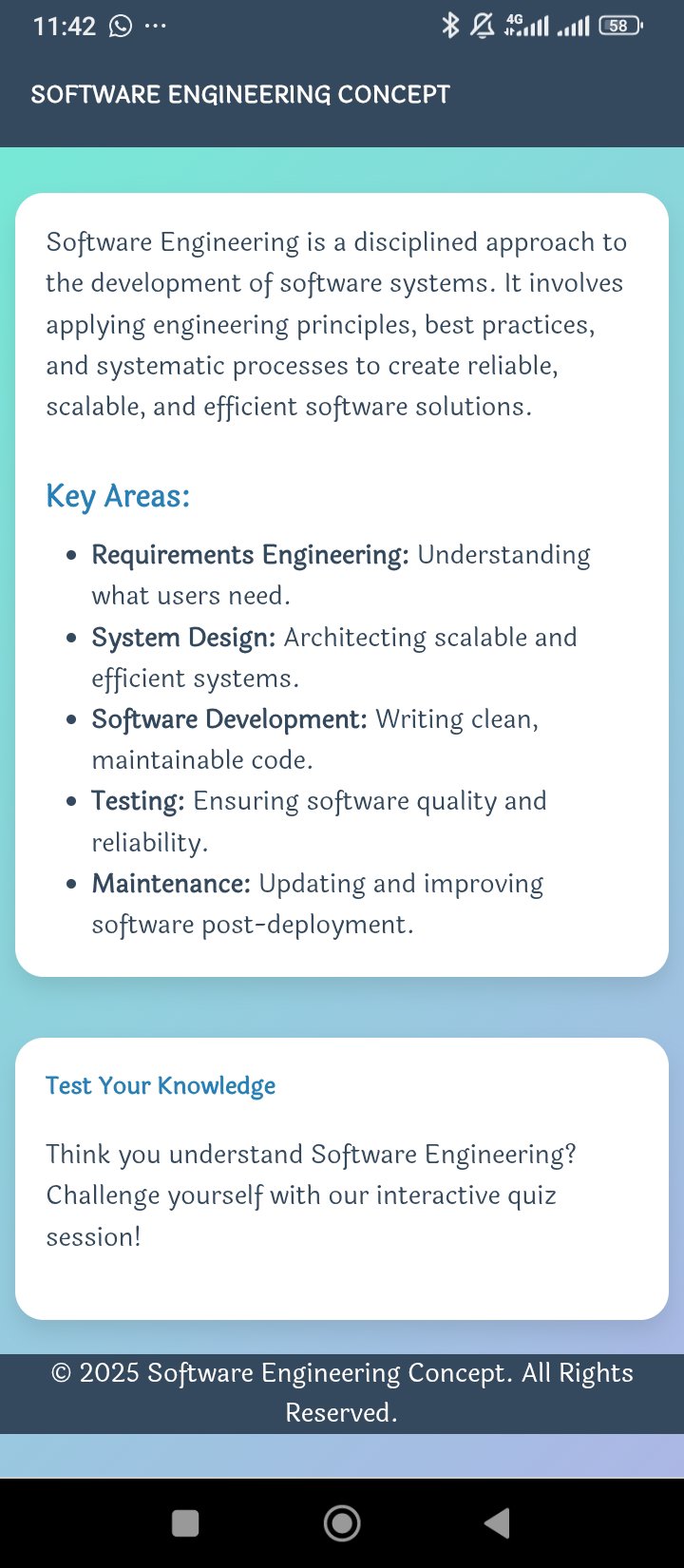This app deals with the prerequisite of software engineering. It takes you into a general understanding of what software engineering is all about. There is a quiz session to test your overall knowledge and understanding. Feel free to explore and make sure you grasp every content of this app. We look forward to see you soon and we wish you the very best.