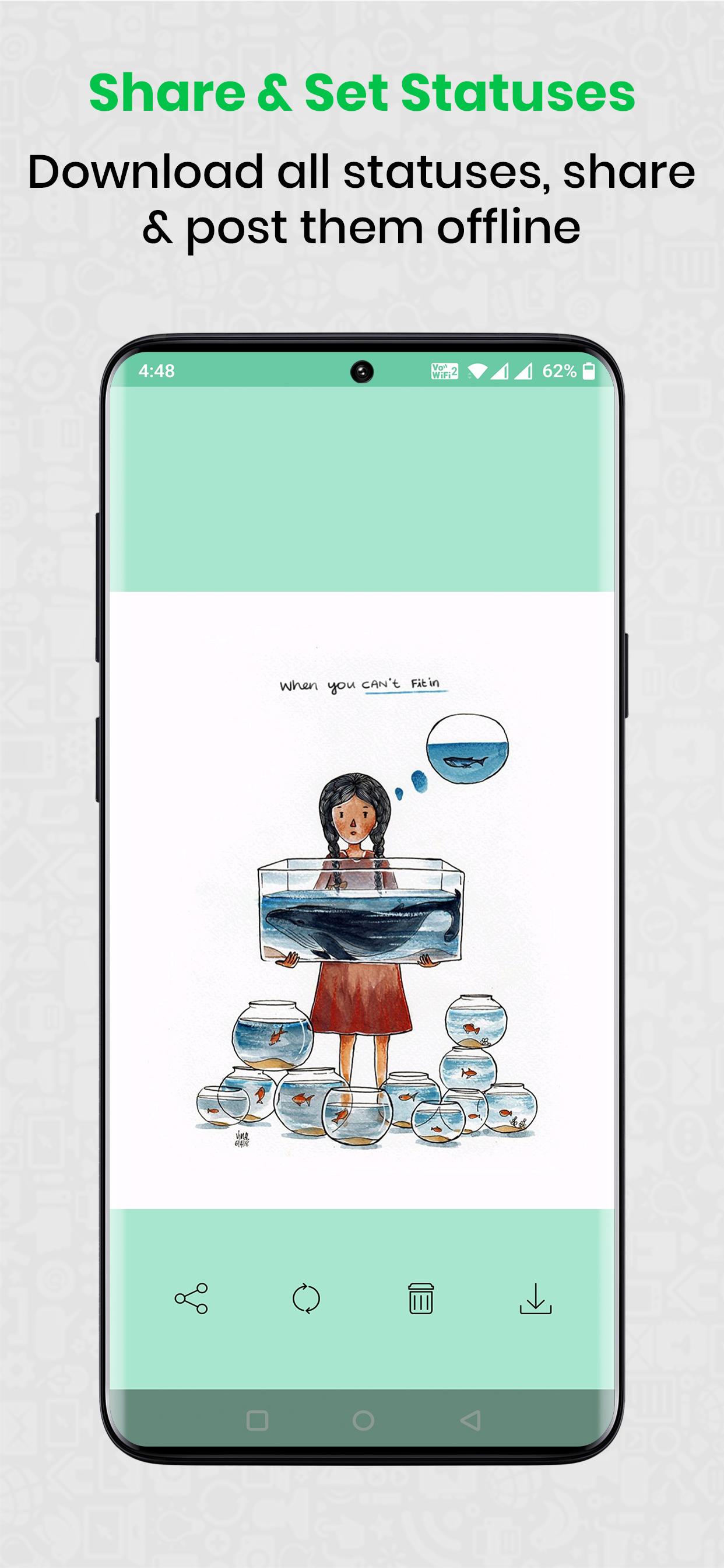 Apl cerita WhatsApp direka dan dibangunkan dengan mengambil kira keperluan generasi moden yang ingin selangkah ke hadapan. Jadi kini anda boleh kekal di hadapan dengan aplikasi muat turun video status ini dan membuat rakan anda cemburu dengan berkongsi trend, berita, acara terkini dan semuanya kelihatan menarik dan menarik kepada anda sebagai status WhatsApp anda.