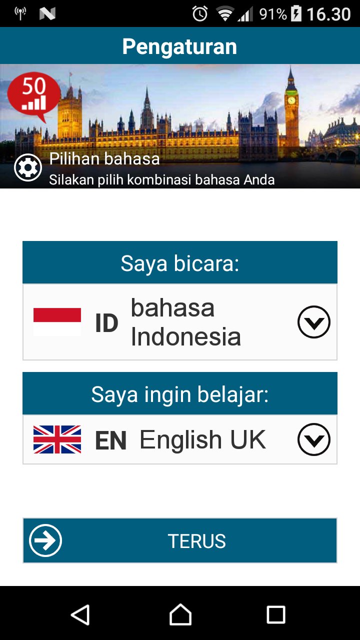 1. Di Menu Utama, ketuk "Pilih bahasa". Kemudian pilih bahasa asli Anda dan bahasa yang ingin Anda pelajari. Tetap online selama 10 menit agar semua file suara untuk bahasa ini dapat diunduh di latar belakang. Anda dapat bekerja secara offline kemudian.