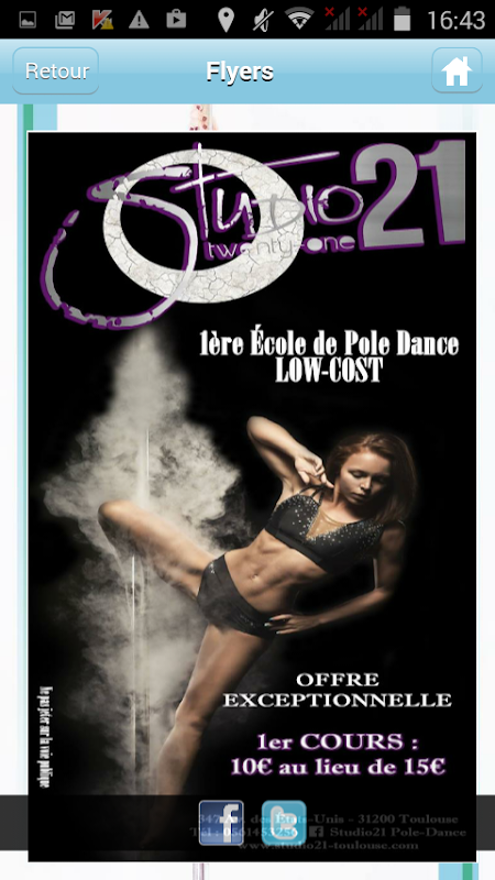 L'application "Studio 21" vous offre la possibilité de consulter toutes les infos utiles de la salle de sport (Tarifs, programmes, avis…) mais aussi de recevoir leurs dernières News ou Flyers sous forme de notifications Push.