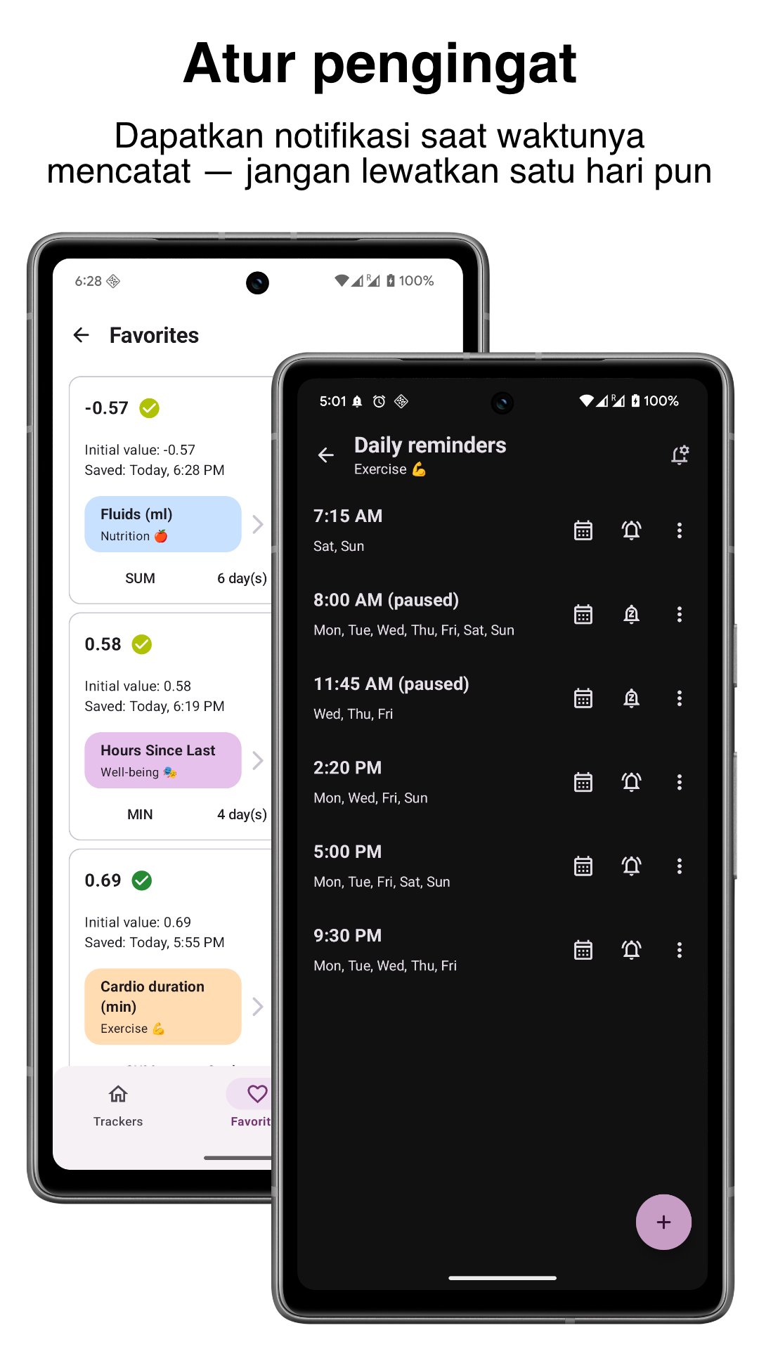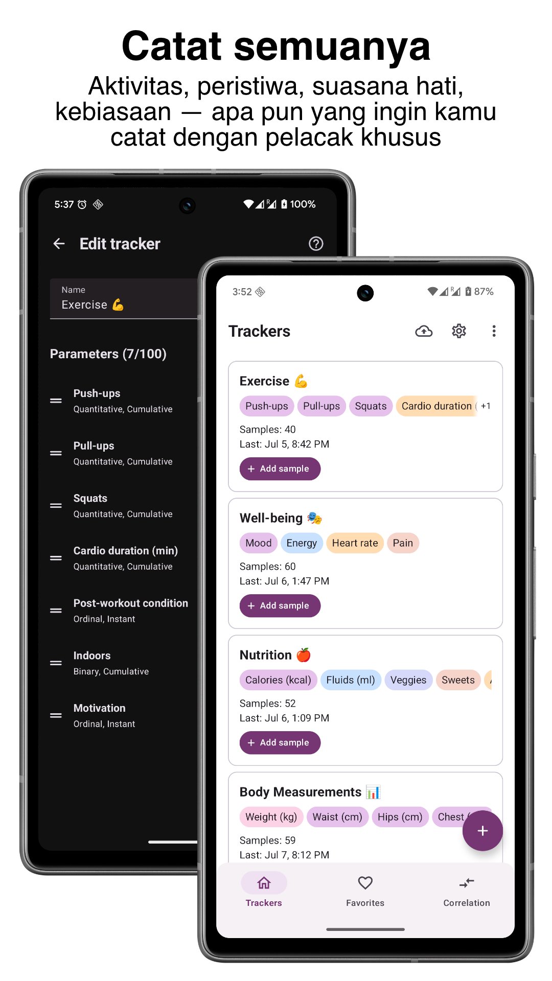 Apa pun yang Anda pedulikan — diet, olahraga, produktivitas, atau nyeri — Tracker memungkinkan Anda mencatat segalanya dan melacaknya sesuai keinginan Anda.