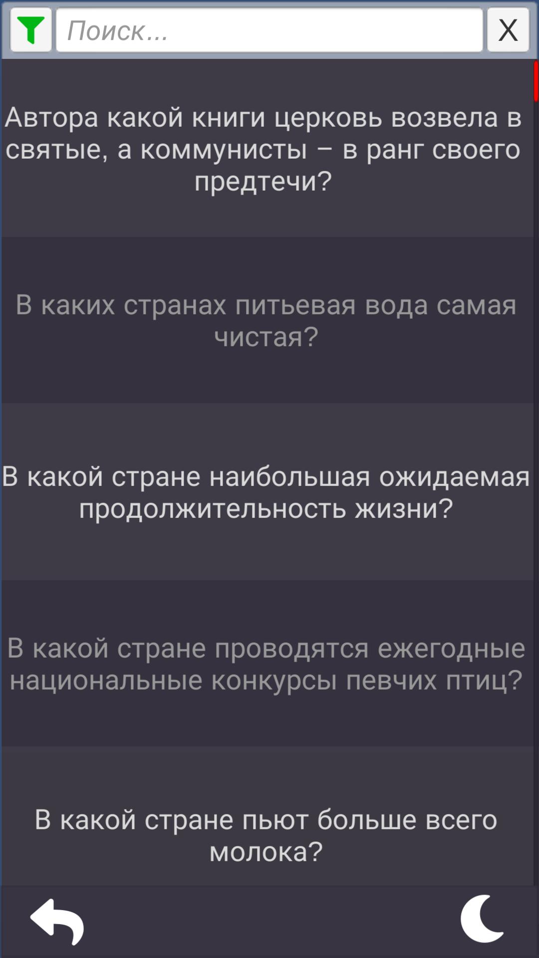 Deze applicatie bevat unieke feiten over natuurkunde en aardrijkskunde, scheikunde en biologie, religie en mythologie, astronomie en astrofysica. De hoofdtaak van de applicatie is niet zozeer het informeren van de lezer als wel het wekken van interesse in een bepaald kennisgebied. Gericht aan zowel scholieren als degenen die de leerplichtige leeftijd al lang hebben verlaten, leergierig en strevend om nieuwe dingen te ontdekken. De vragen en antwoorden die in de bijlage zijn verzameld, geven je de gelegenheid om na te denken over de verbazingwekkende diversiteit van de omringende wereld en over het verbazingwekkende menselijke vermogen om deze te kennen, over de grenzeloze kracht van de rede en zijn vernederende afhankelijkheid van belachelijke vooroordelen, over de adel en laagheid van de menselijke ziel, en over vele, vele andere dingen.Last updated on Apr 4, 2020