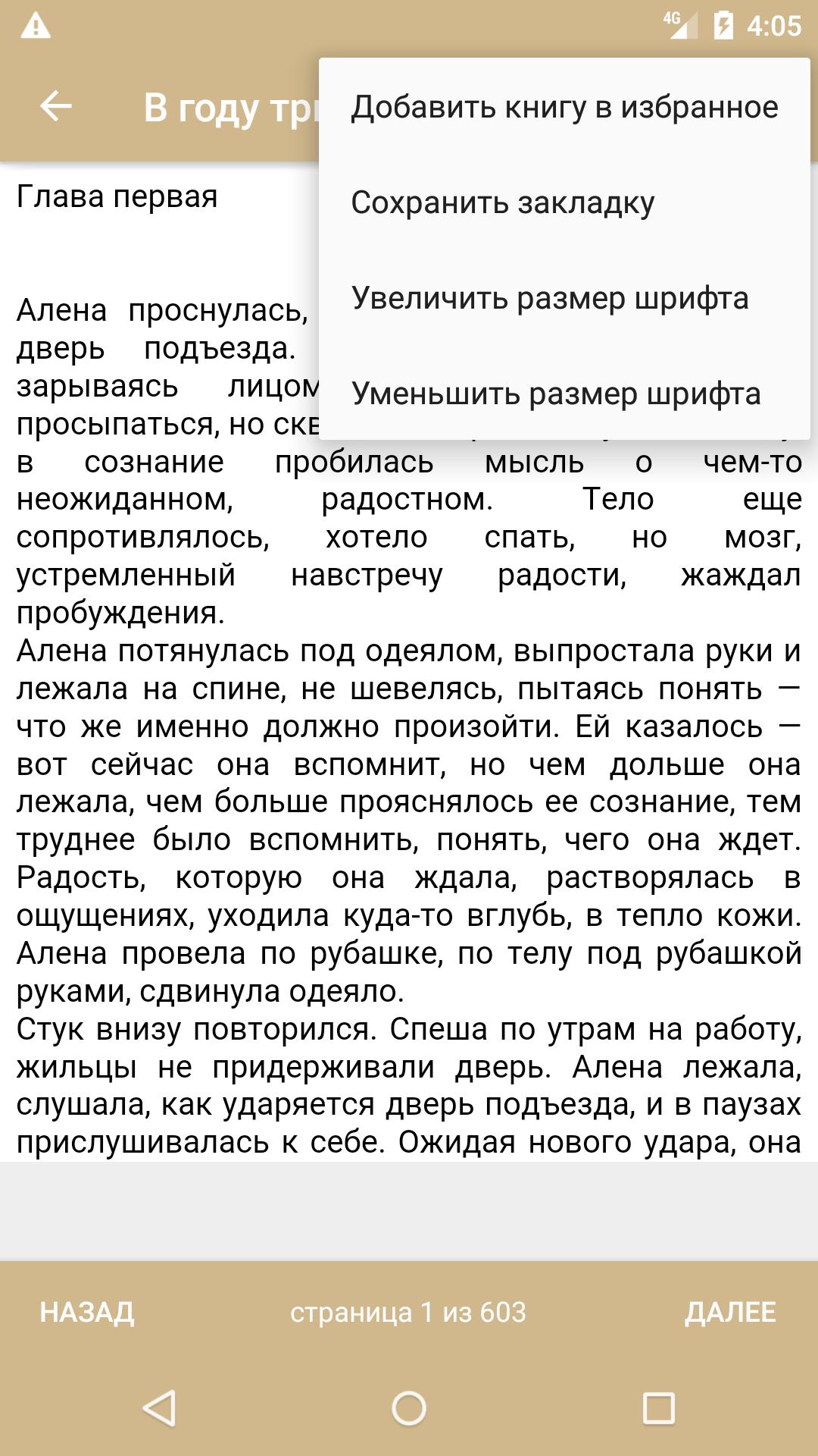 Приложение "Лучшие книги в жанре Роман бесплатно" позволяет вести список избранных книг, использовать удобный поиск по названиям и авторам. Приложение запоминает ваш текущий прогресс чтения и позволяет вернуться к последней странице быстро и удобно. Также вы можете изменить размер шрифта на свой вкус для максимально удобного чтения книг.