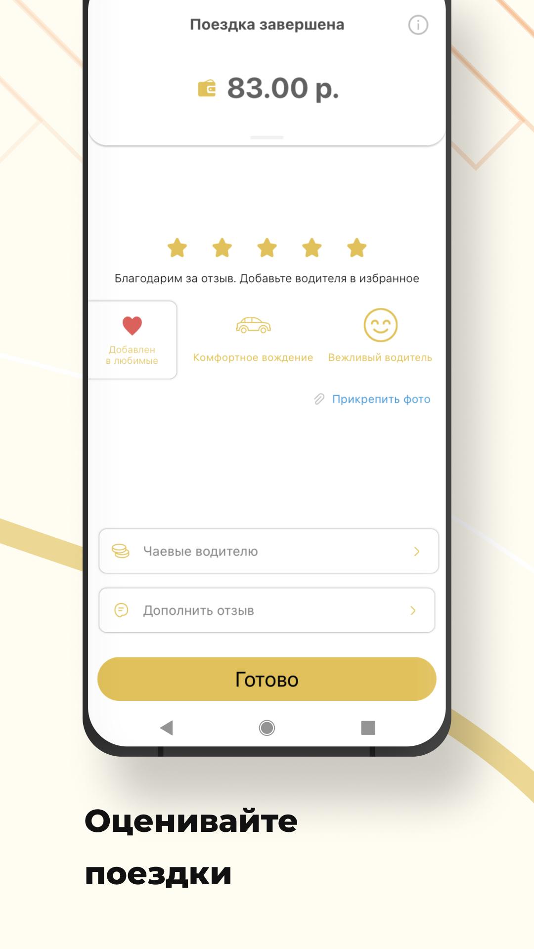 Поставьте оценку водителю, напишите отзыв или выберите реакцию из готовых шаблонов. Прикрепите фотографию к отзыву, оставьте чаевые или посмотрите детализацию платежей после поездки.