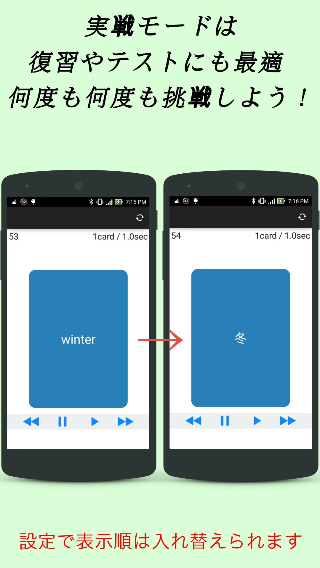 ・英単語をゆっくり覚えたい場合は、一時停止を押せば、一枚ずつ英単語カードをめくることも可能です。