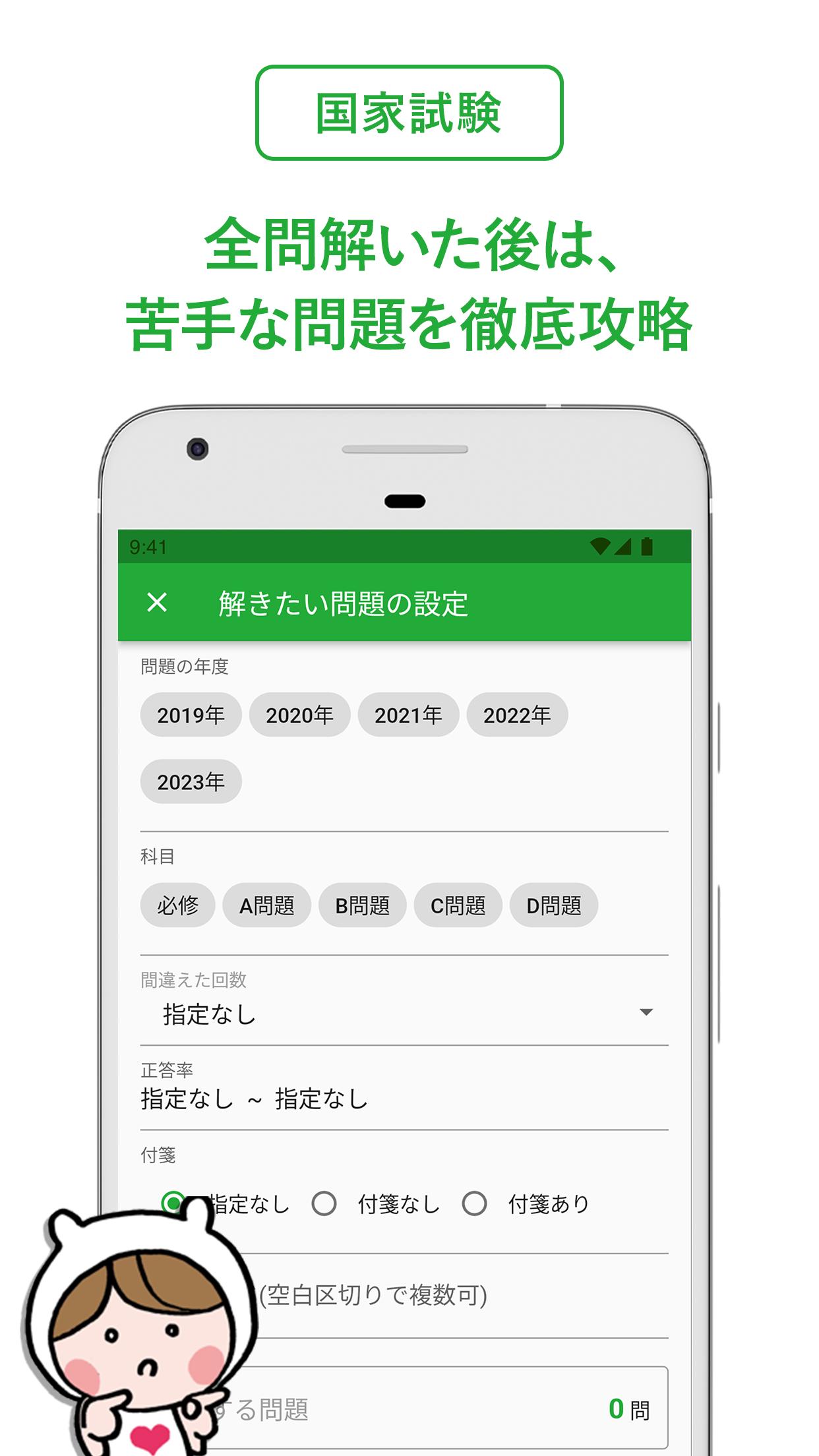 Omdat u vragen kunt selecteren op basis van uw eigen omstandigheden, kunt u vragen uit het verleden die u interesseren zo vaak als u wilt oplossen tot de dag van het Nationaal Tandheelkundig Onderzoek.