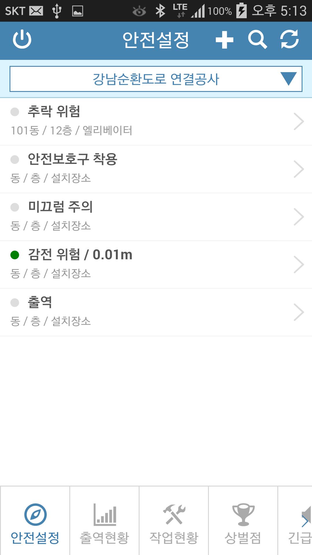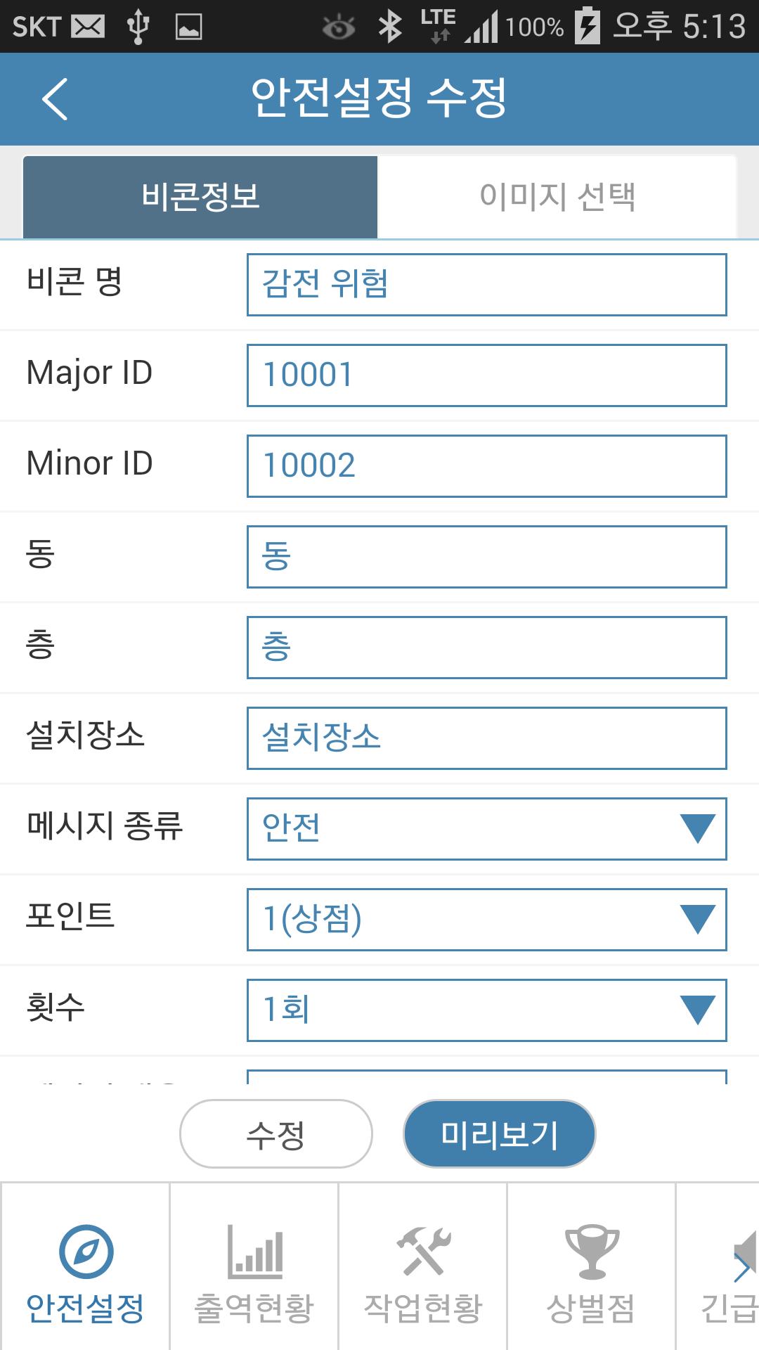 1. 안전설정: 현장내 설치된 비콘 정보를 등록하고 관리 할 수 있습니다