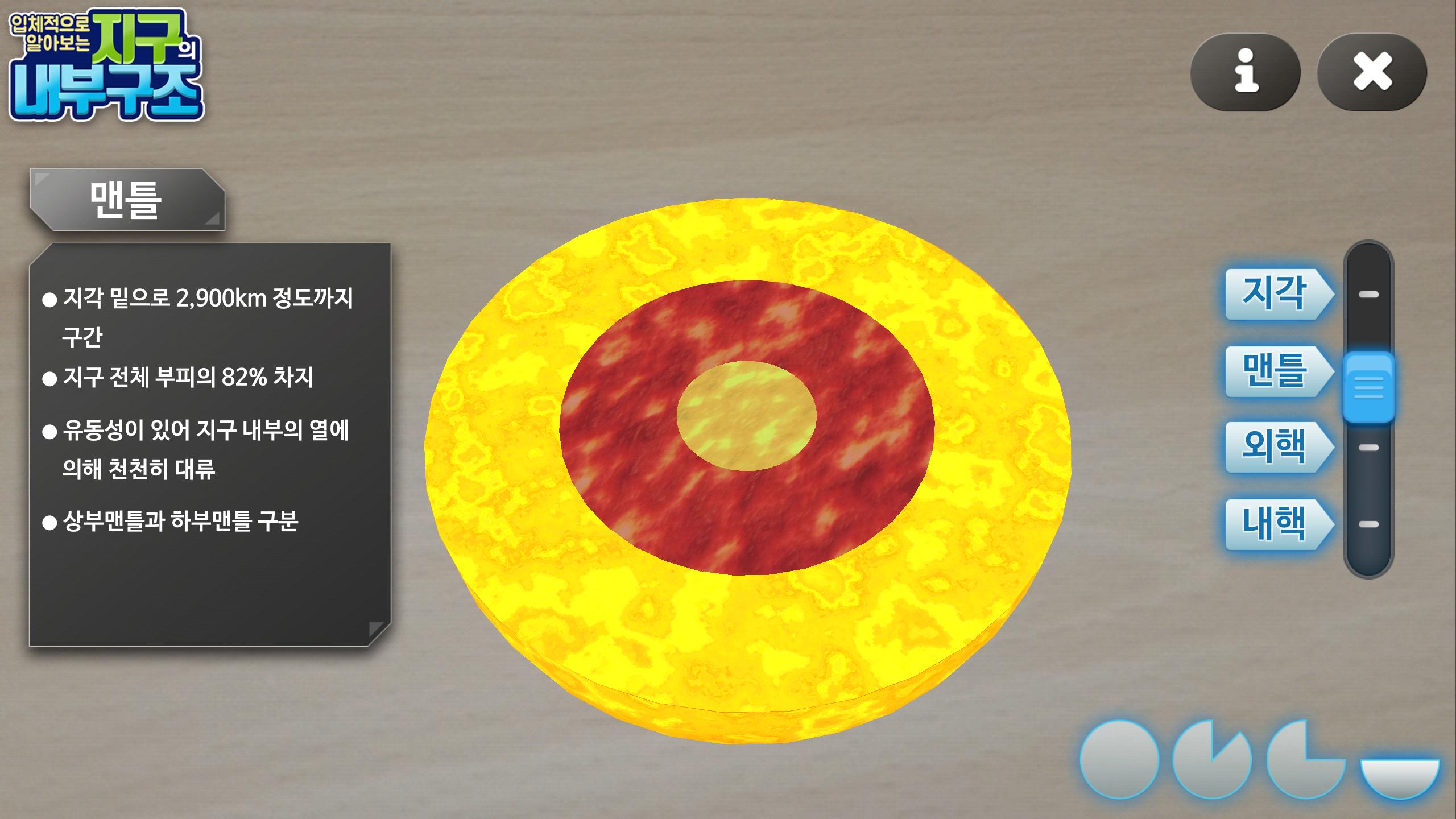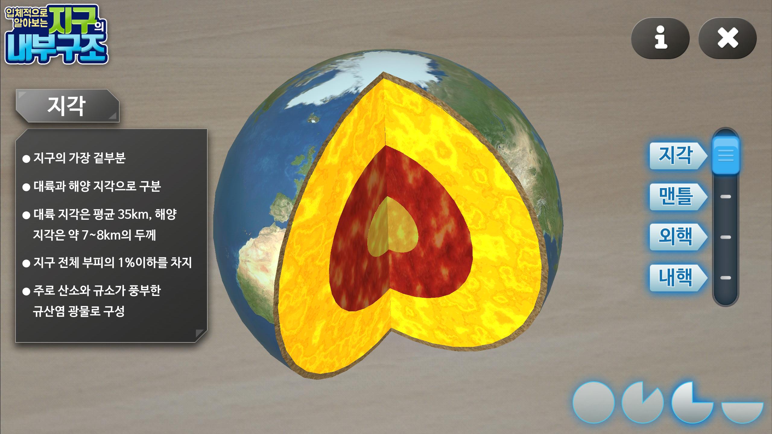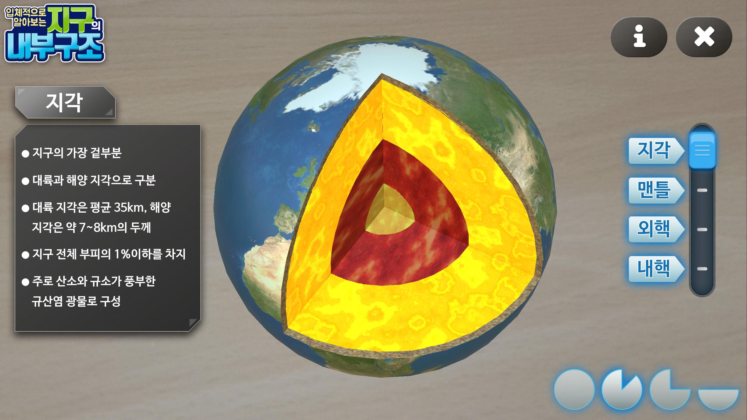 왼쪽 막대 바를 이용해 원하는 층만 따로 볼 수 있고 오른쪽 하단 버튼들을 통해 잘려지는 지구의 단면 사이즈를 조절 할 수 있습니다.