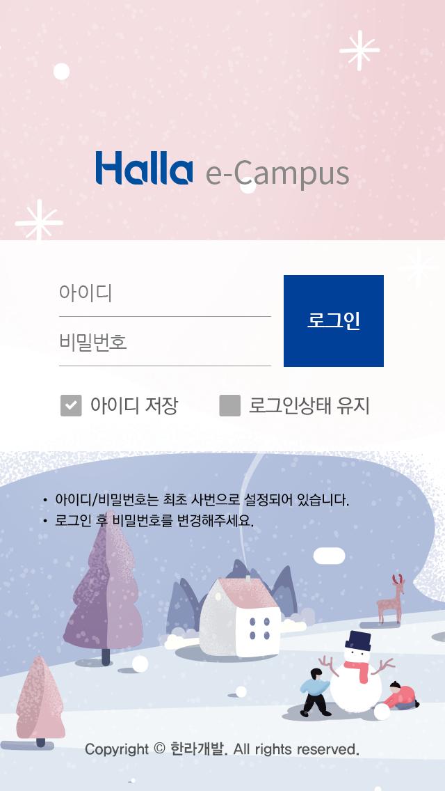 PC환경의 한라개발 e-Campus (https://halladvp.hunet.co.kr) 의 아이디와 비밀번호로 로그인 가능하며, 주요 서비스를 본 모바일 앱에서도 사용하실 수 있습니다.