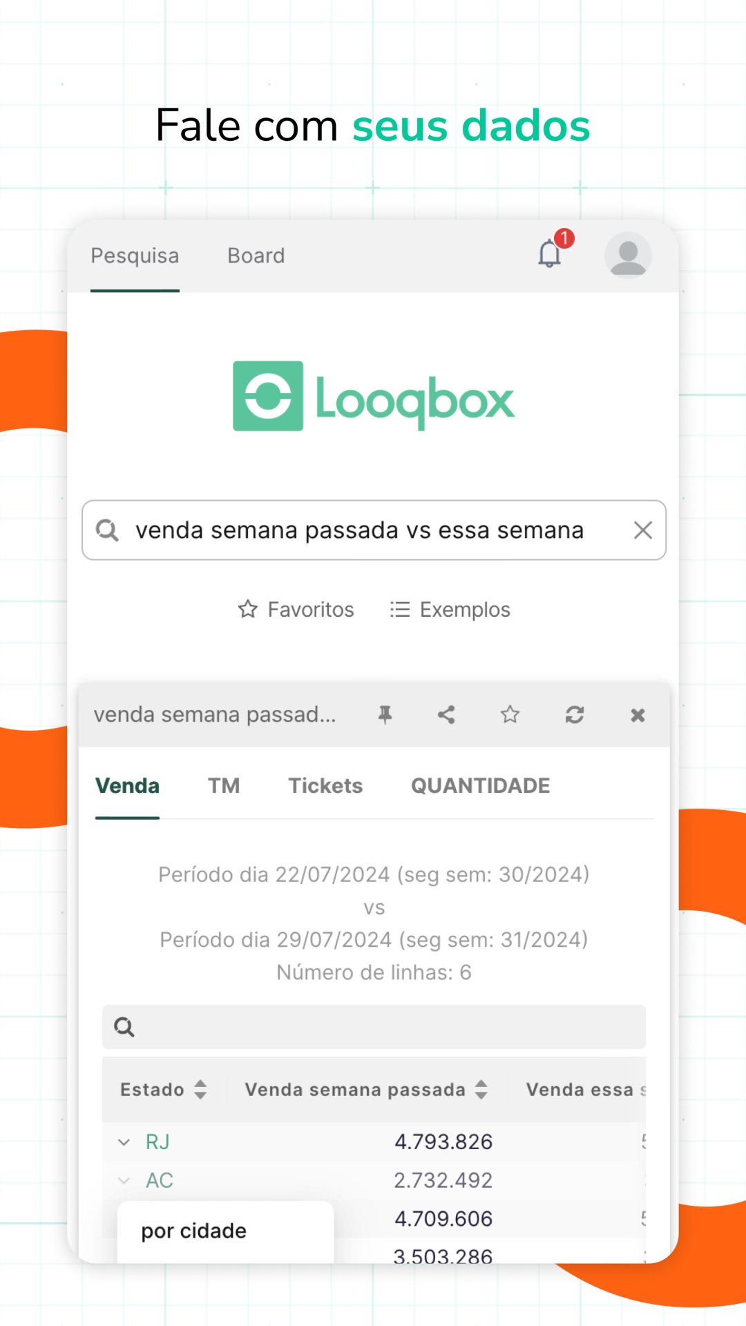 Met behulp van onze kunstmatige intelligentie versnelt u de transformatie van gegevens in resultaten door overal toegang te krijgen tot uw bedrijfsinformatie. Krijg inzicht en navigeer eenvoudig en snel door uw data met de kracht van Looqbox.