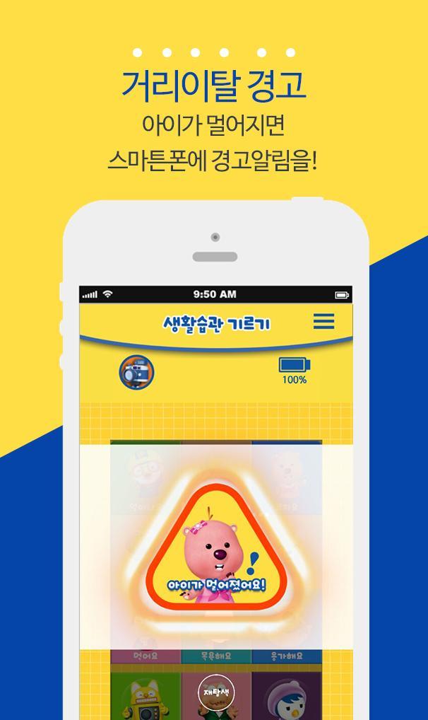 1) 경고알림: 뽀로로 스마트 밴드와 등록한 휴대폰이 일정거리를 벗어났을 경우 경고음을 통해 알려줍니다.