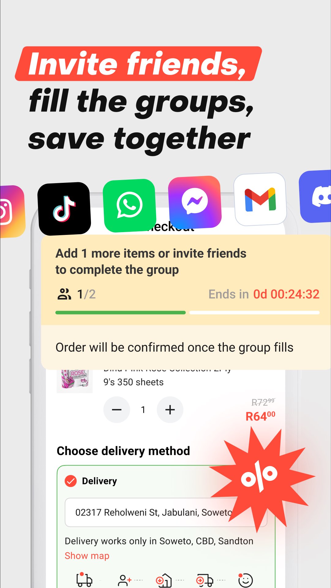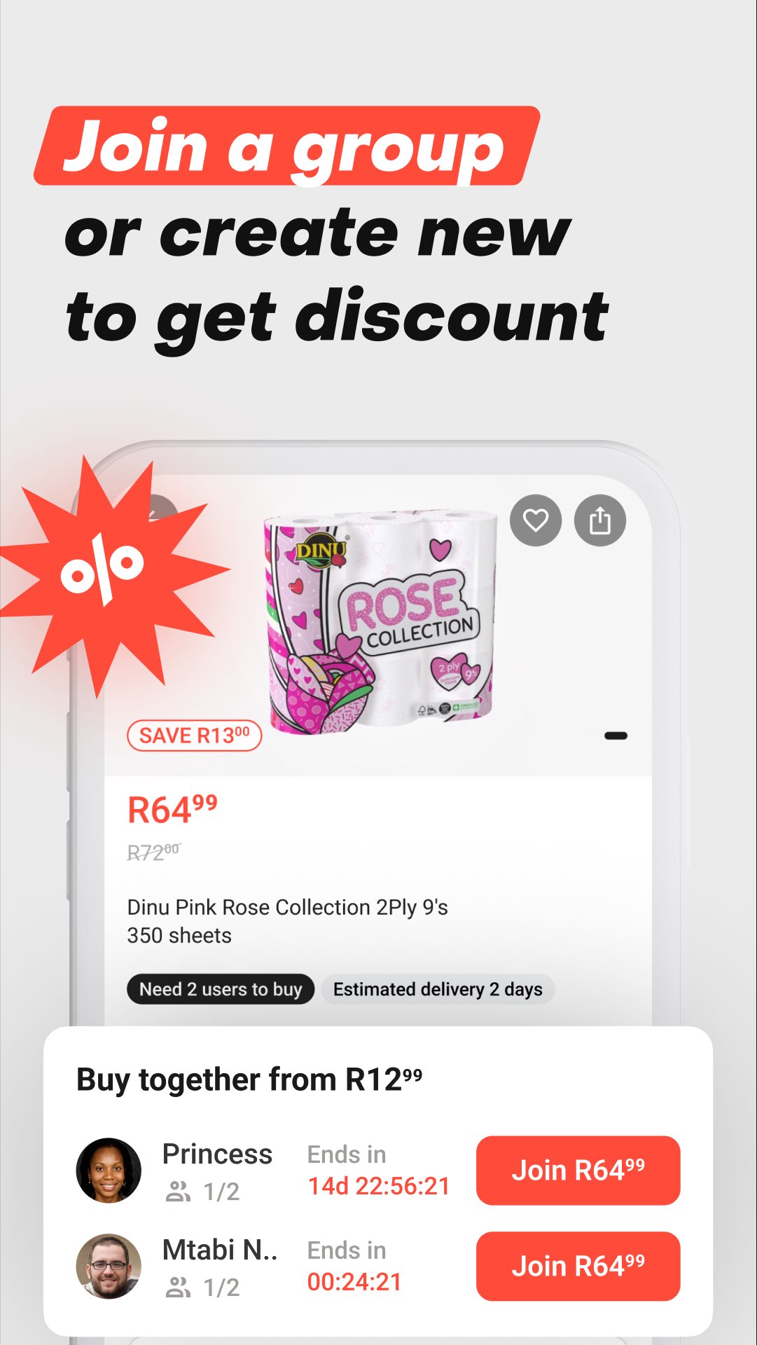 - Moeiteloos groepsaankopen: sluit u aan bij bestaande groepen of creëer uw eigen groepen met vrienden en familie voor maximale besparingen.