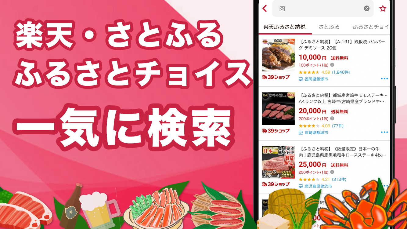 ふるさと納税 返礼品検索・比較アプリなら、特に人気の「楽天」「さとふる」「ふるさとチョイス」の返礼品を一括検索できます。