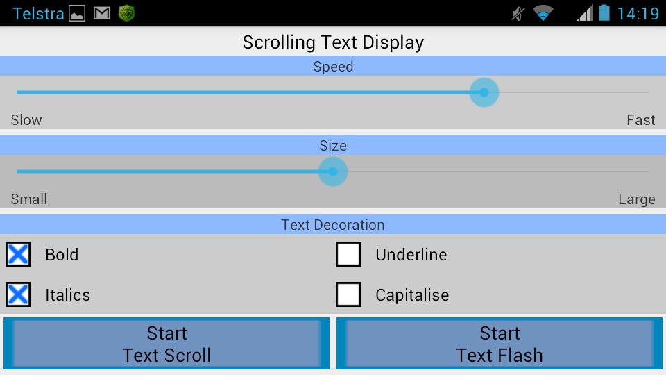 Wielkość i szybkość tekst można łatwo zmienić. Możesz mieć rozmiary tekstu, począwszy od bardzo małych do bardzo dużych (który zajmuje większą część ekranu). Duży tekst jest idealny do wykorzystania, gdy chcesz pokazać wiadomość do kogoś, kto jest daleko. Również tekst można przewijać / wyświetlane bardzo wolno lub bardzo szybko.