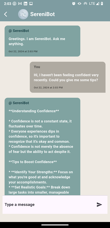 SerenitySpace to osobista aplikacja wellness zaprojektowana, aby pomóc Ci zarządzać swoim zdrowiem psychicznym za pomocą codziennego dziennika, wsparcia na czacie AI i rekomendacji muzycznych. Niezależnie od tego, czy chcesz śledzić swoje samopoczucie emocjonalne, porozmawiać ze wspierającą sztuczną inteligencją, czy znaleźć dobrą muzykę, ta aplikacja oferuje bezpieczną przestrzeń do refleksji i wyrażania siebie. Należy pamiętać, że ta aplikacja nie zastępuje profesjonalnej opieki psychiatrycznej. Jeśli masz poważne wątpliwości, zachęcamy do skontaktowania się z licencjonowanym specjalistą. Aby uzyskać pomoc, skontaktuj się z [email protected].Last updated on Oct 22, 2024