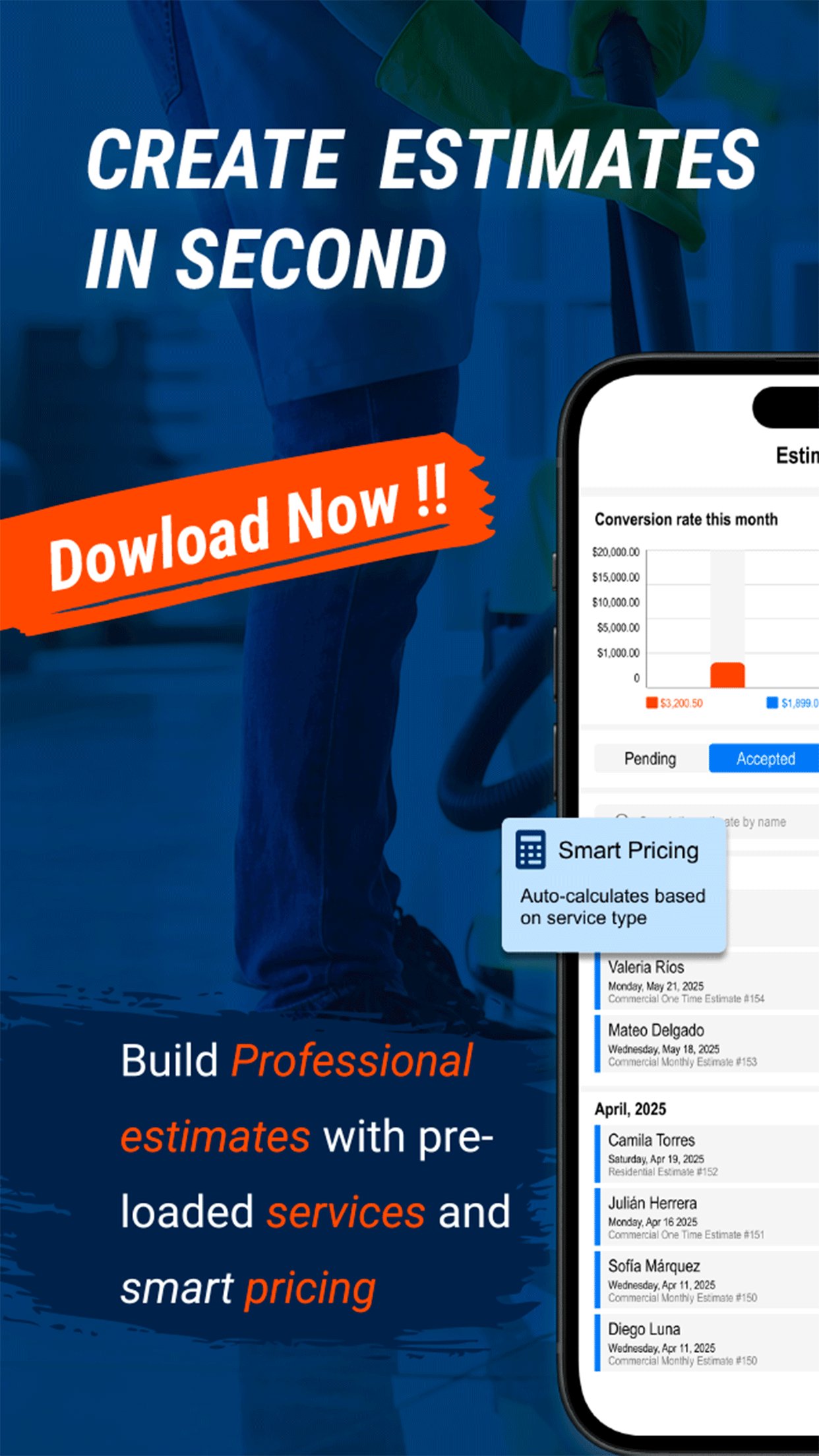 Natychmiastowe szacunki: szybko generuj i wysyłaj szacunki dotyczące zadań związanych ze sprzątaniem obiektów mieszkalnych i komercyjnych, niezależnie od tego, czy są to jednorazowe zlecenia, czy umowy miesięczne.