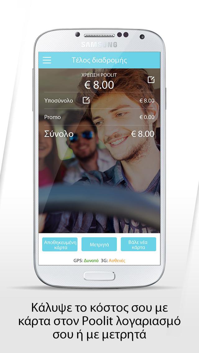 Μετά το τέλος της διαδρομής, ο συνεπιβάτης θα σε βοηθήσει να καλύψεις το κόστος του οχήματος σου με κάρτα στον Poolit λογαριασμό σου ή με μετρητά