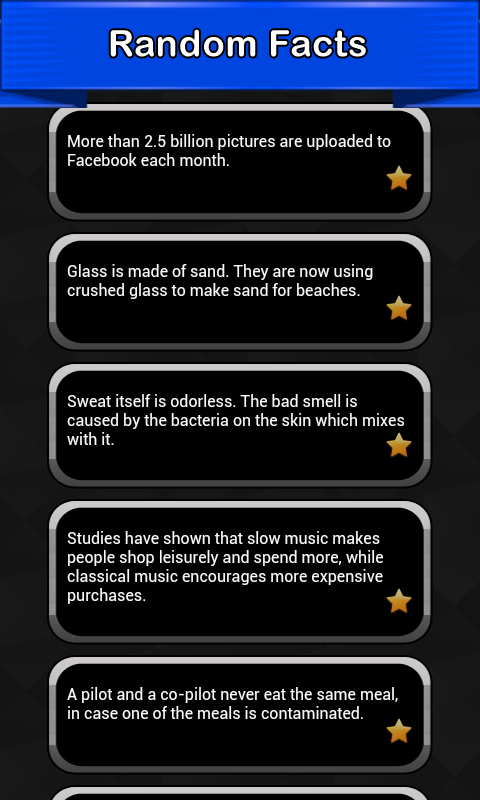 Are you looking for the best collection of Random Facts for your mobile device? This app is filled with cool random funny facts about life, animal facts, science, history, people, and more. Random interesting facts about the world we live in that you might find useless, weird, crazy or awesome! Puzzle your friends and family with the most random facts for kids, about sports, food, human body and other stupid but true facts you should know. If you want to make some people laugh, pull out your phone and read a funny random fact that you didn't know. Download and install this free random facts app and learn something new, fun and amazing every day!Last updated on Apr 14, 2016