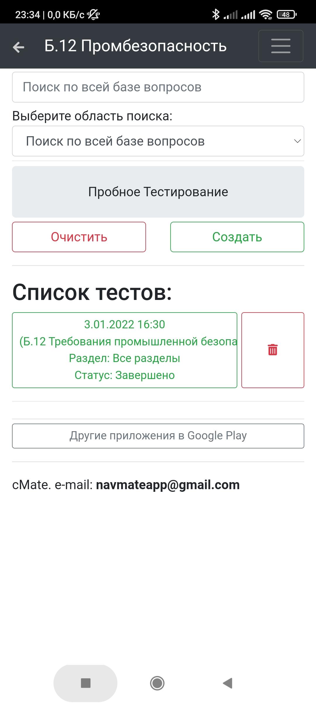 Приложение содержит полную базу вопросов и ответов с возможностью пройти пробный тест.