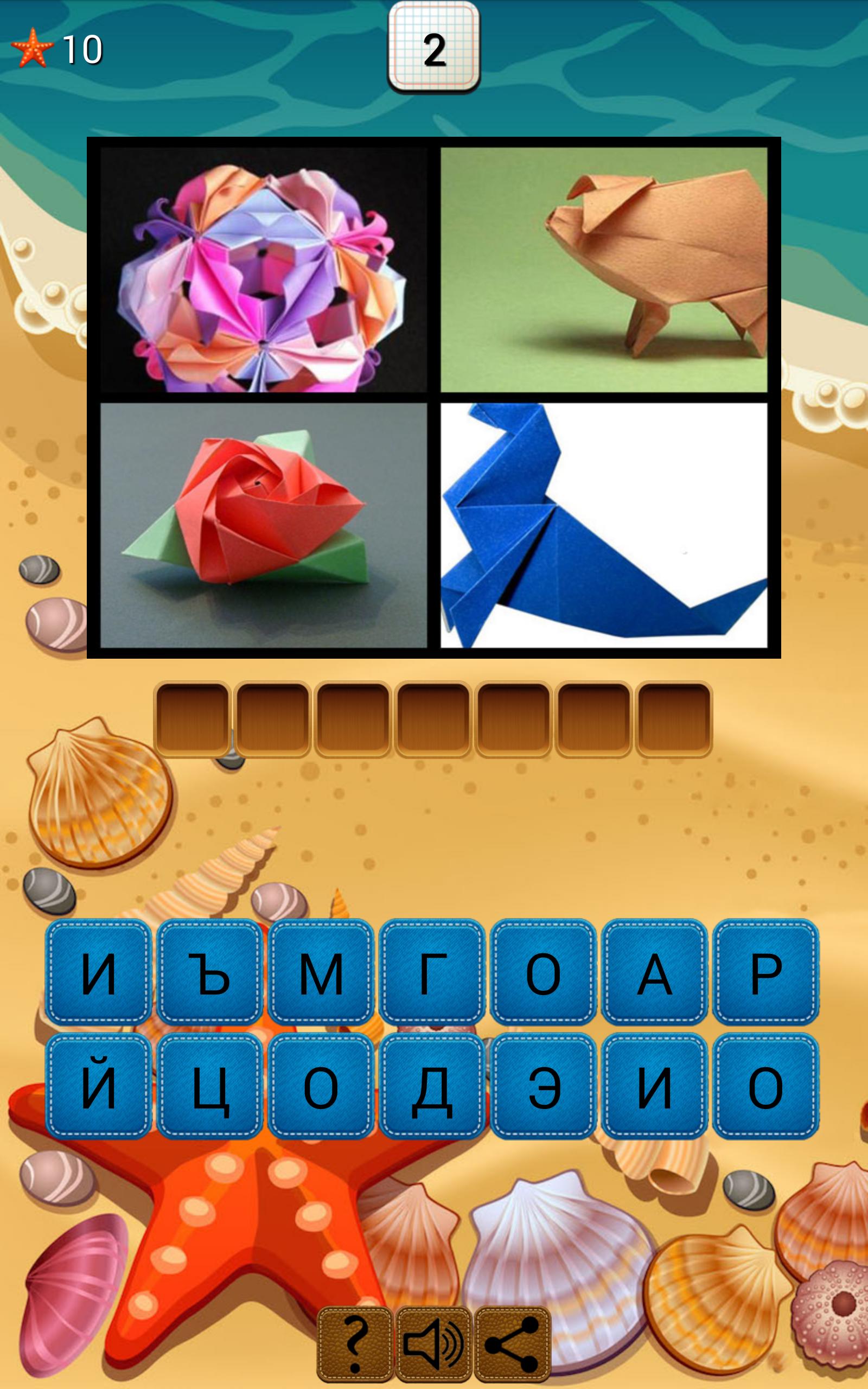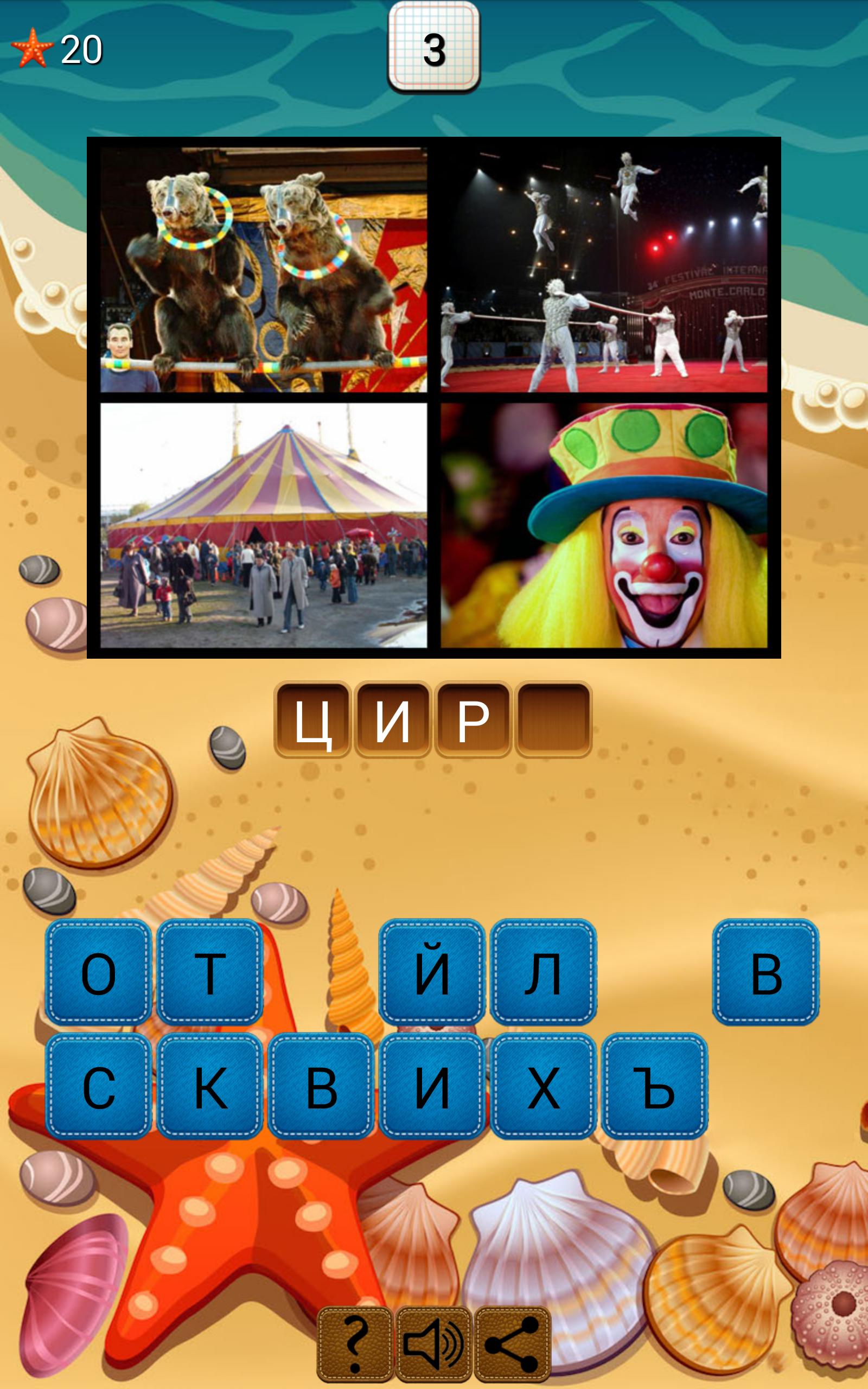 игры-викторины. Смысл игры в том, чтобы по четырем фото угадать ключевое слово. За правильный ответ игрок получает 10 баллов, за 50 баллов можно воспользоваться подсказкой. Четыре фото одно слово на русском языке и создавалось для русскоязычной аудитории.