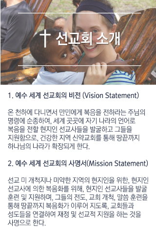 2. 예수세계선교회의 사명서(Mission Statement) : 선교 미 개척지나 미약한 지역의 현지인을 위한, 현지인 선교사에 의한 복음화를 위해, 현지인 선교사들을 발굴훈련 및 지원하며, 그들의 전도, 교회개척, 말씀훈련을 통해 땅끝까지 복음화가 이루어 지도록, 교회들과 성도들을 연결하여 재정 및 선교적 지원을 하는 것을 사명으로 한다.