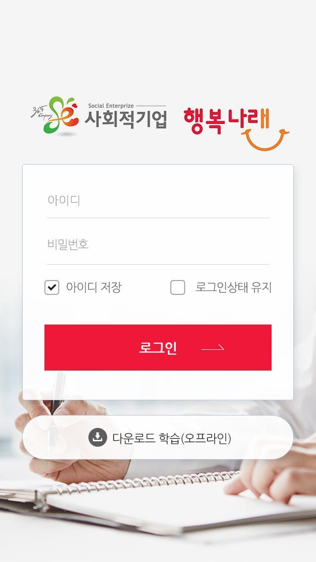 PC환경의 행복나래(주) 연수원(http://happynarae.hunet.co.kr)의 아이디와 비밀번호로 로그인 가능하며, 주요 서비스를 본 모바일 앱에서도 사용하실 수 있습니다.