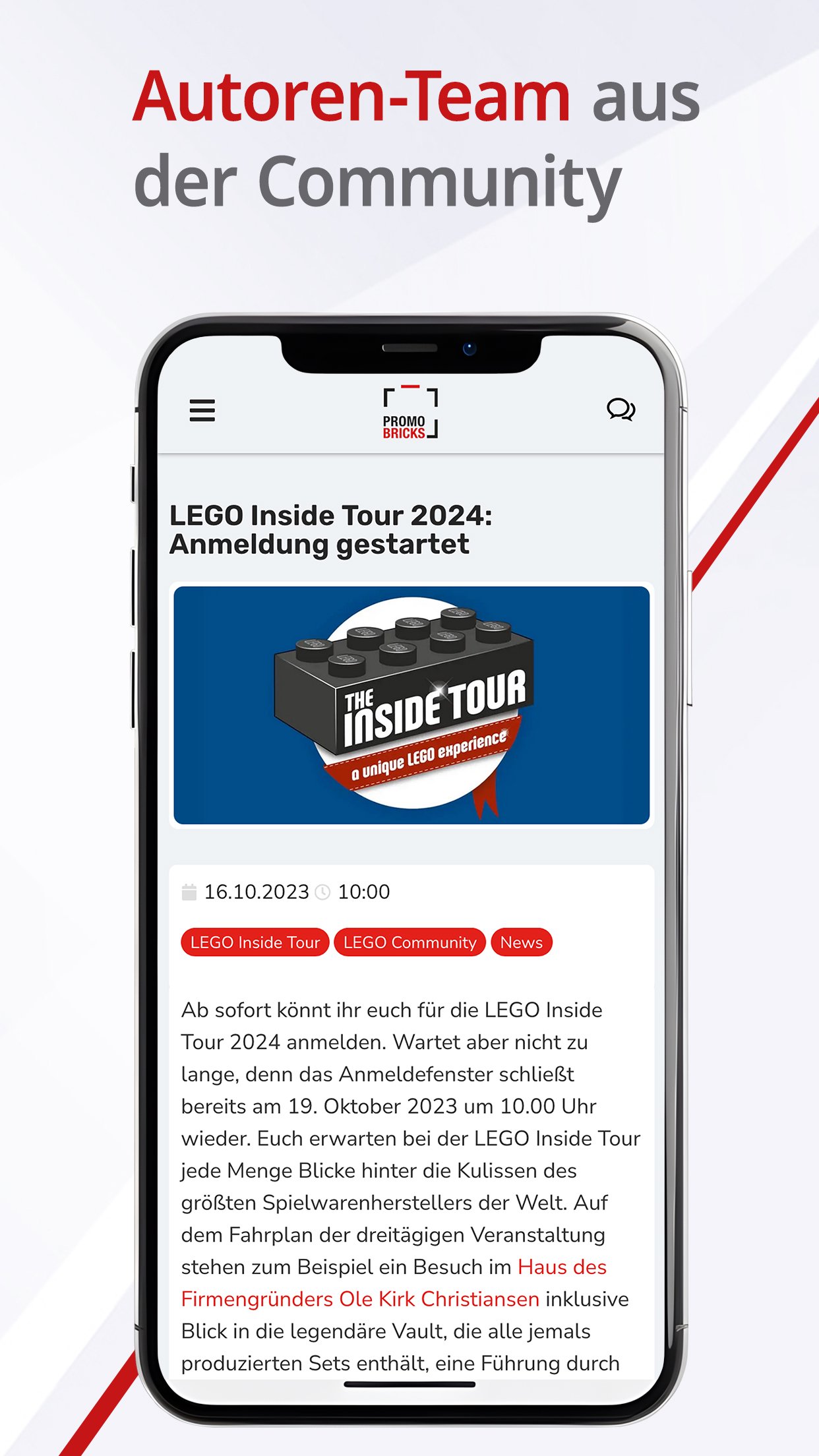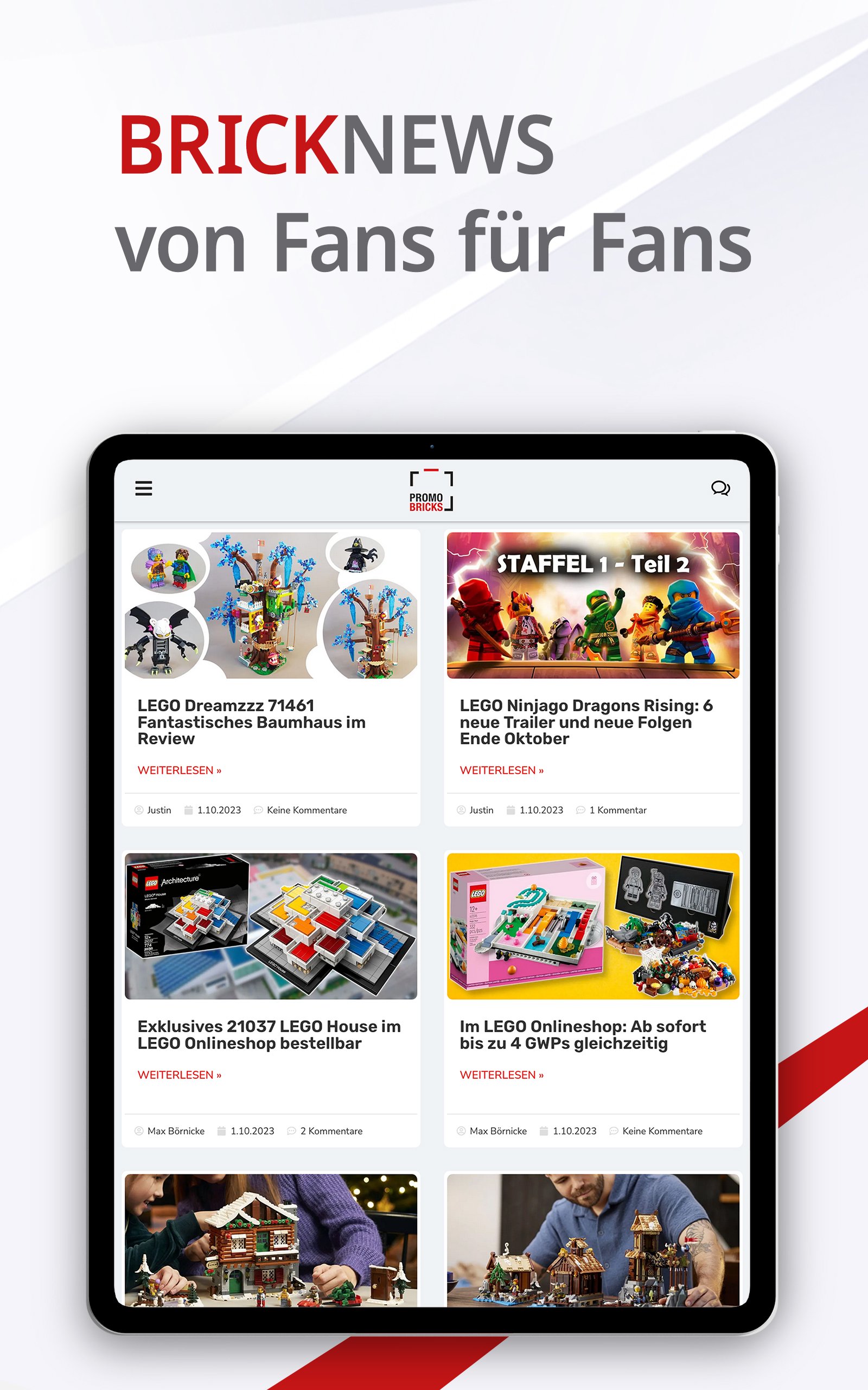 PROMOBRICKS — одна из самых масштабных новостных платформ, специализирующаяся на популярных зажимных блоках из Дании. Первая статья на сайте появилась в сети в 2013 году. С тех пор фан-сайт постоянно развивался и значительно вырос. Сегодня за предложением стоит целая команда авторов, которые сообщают независимо и актуально. Помимо новостей от фанатов для фанатов, читатели найдут текущие обзоры, слухи о новых выпусках, советы по покупке наборов и минифигурок, новости сообщества и подробный планировщик для фанатов с датами выставок, фондовых бирж и встреч с фанатами.