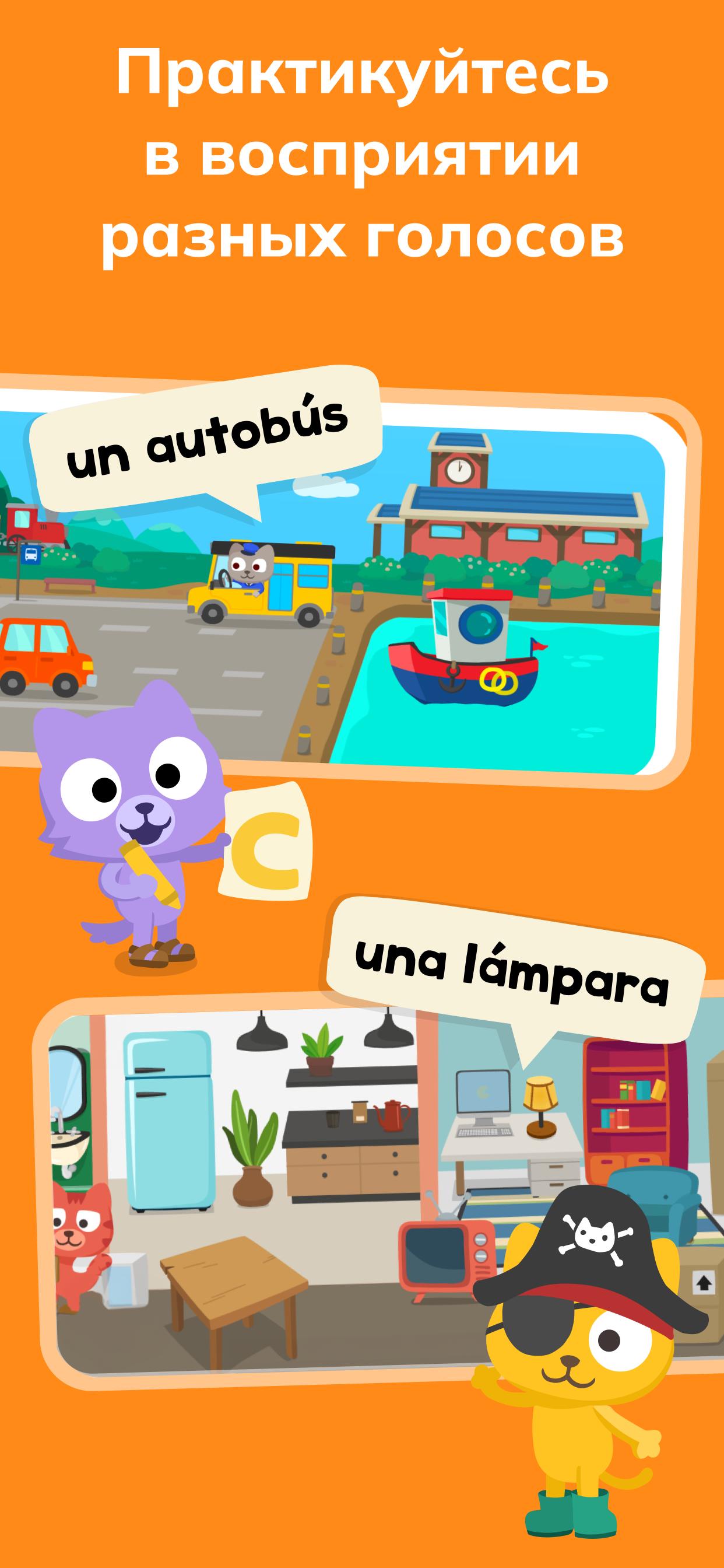 • Разнообразие голосов. Наши персонажи говорят разными тонами, с разными выражениями и акцентами, чтобы дети могли улавливать тонкости произношения разных носителей языка.