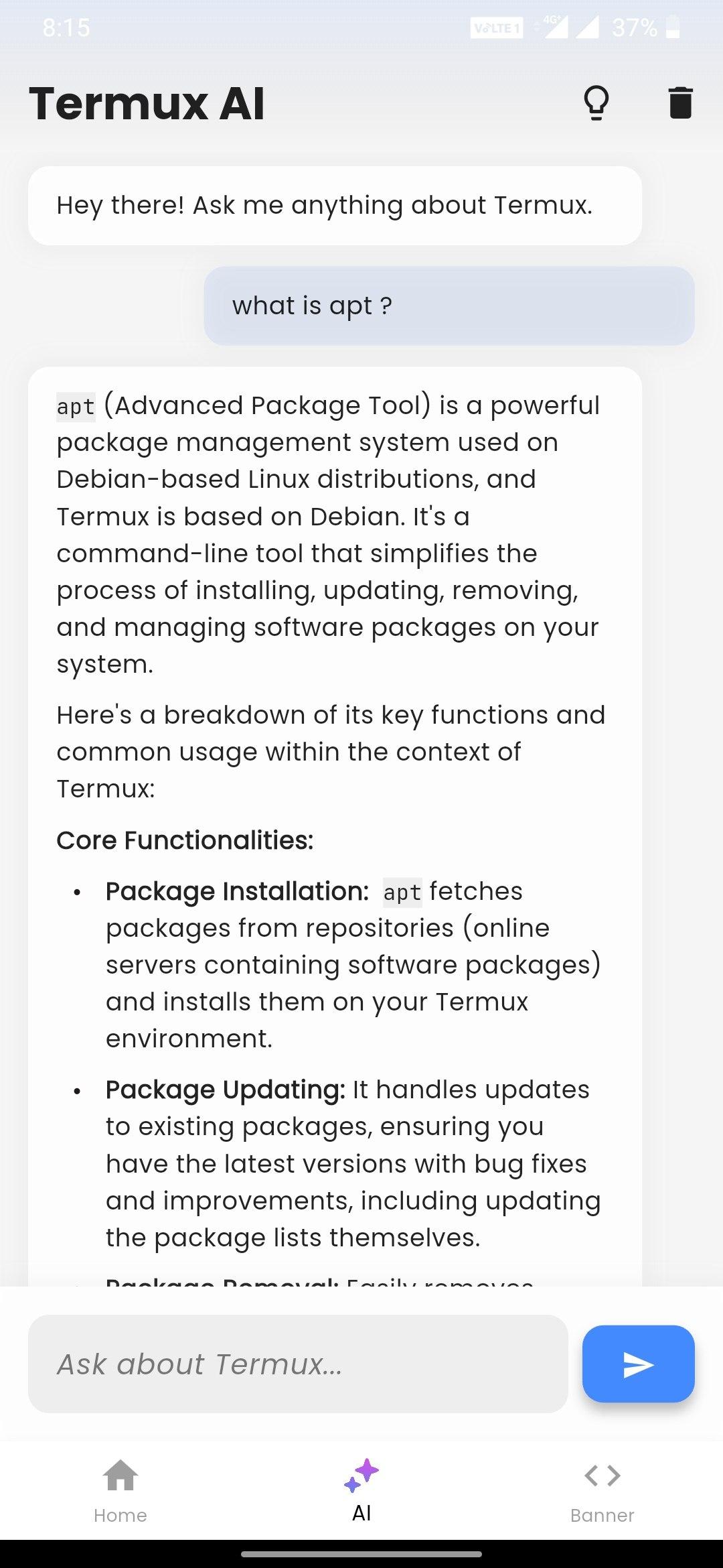 Задайте любой вопрос в руководстве Termux AI — от «Как мне установить Python?» на «Исправить мой сценарий». Получите мгновенные и умные ответы, адаптированные к Termux. Это ваш круглосуточный помощник для команд, устранения неполадок и советов.