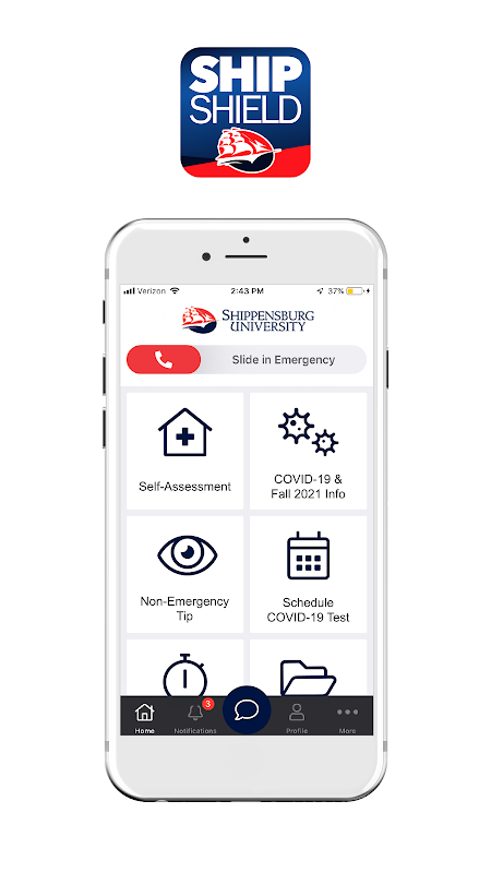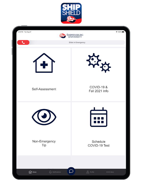 Use Ship Shield to add an additional layer of protection to your campus experience by utilizing tools such as: COVID Self-Assessment, Panic Slider, Non-Anonyomous Tips and Safety Timer.