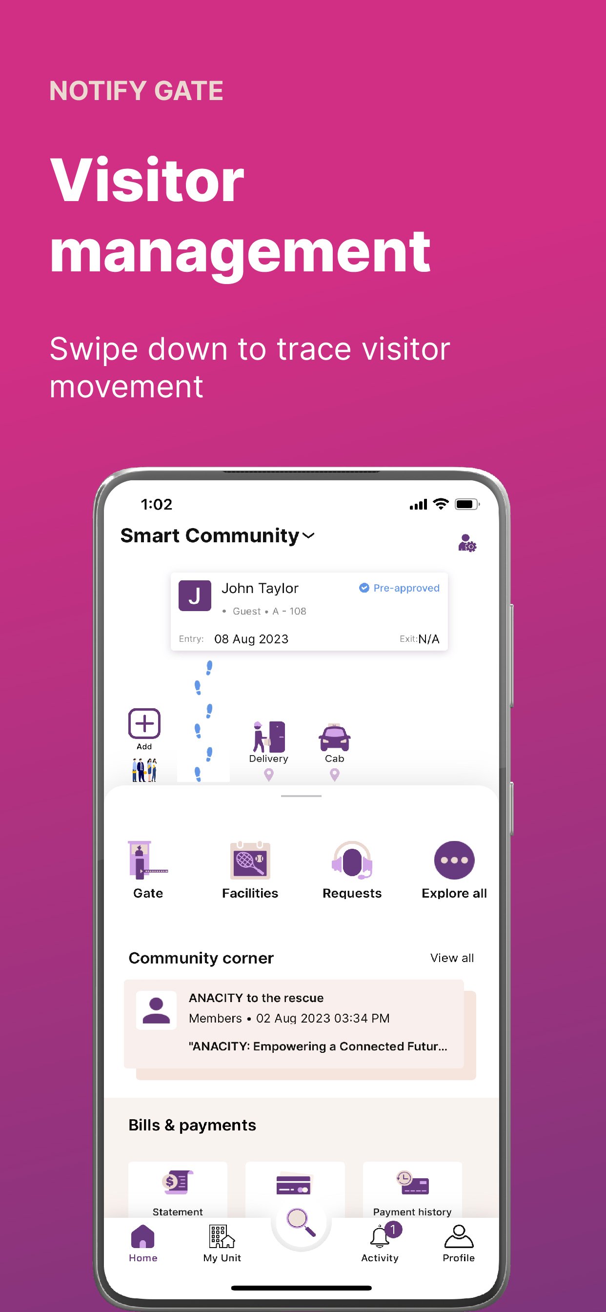 ผู้อยู่อาศัยสามารถดำเนินการต่างๆ ในแอป ANACITY ได้ที่บ้านอย่างสะดวกสบาย รวมถึงจัดการผู้เยี่ยมชม พนักงาน การร้องเรียน/คำขอ ชำระค่าบริการและค่าธรรมเนียมอื่นๆ จองสิ่งอำนวยความสะดวก สื่อสารและแบ่งปันข้อมูลอัปเดตที่สำคัญกับผู้อยู่อาศัยรายอื่น ฯลฯ