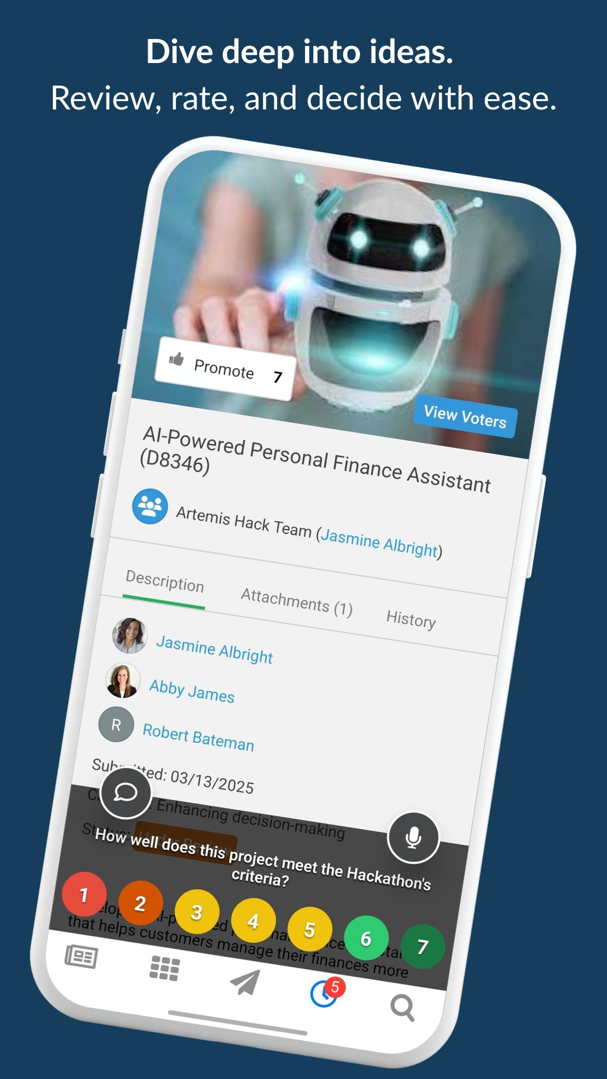 ในฐานะผู้ประเมินแนวคิดให้ทำคะแนนและดัชนีชี้วัดของคุณได้ทุกที่ทุกเวลา! ไม่ว่างที่จะพิมพ์ความคิดเห็นของคุณเกี่ยวกับแนวคิดหรือไม่ ใช้คุณสมบัติการแสดงความคิดเห็นด้วยเสียงของเราและปล่อยการบันทึกเสียงที่ Brightidea จะถอดความเป็นข้อความสำหรับคุณ